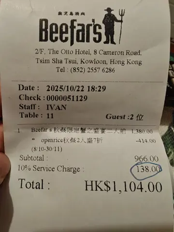 在金马伦道的【Beefar's】,餐厅在The Otto酒店2字楼,门口不是太显眼,是日本海外首间分店,所有萨摩牛均来自鹿儿岛自家农场,天然饲料放牧,由饲养出顶级A5、极罕4%奇迹之牛的得奖饲养员亲自饲养;最近推出了 "花火烧肉祭"的限定菜单,🤩重点是半价每位$2️⃣6️⃣8️⃣🎇🎆花火烧肉祭🎆🎇(星期一至四限定)⭐️烟三文鱼和风沙律⭐️蟹肉三文鱼籽脆片⭐️海鲜味噌汤⭐️萨摩牛腹肉⭐️是日稀少部位⭐️Yaki shabu萨摩牛上等牛肩胛肉⭐️澳洲和牛三角腩⭐️澳洲和牛西冷⭐️美国黑安格斯横膈膜追加⭐️横膈膜烧肉片配盐葱酱 ($118)鹿儿岛的萨摩牛,牛味较香浓、脂肪清爽、适中霜降,富牛味之余又不会太腻,不喜欢油腻感太重的朋友,一定会喜欢😋店员亦推介横膈膜烧肉片给我们,它的肉味较浓郁,有嚼口,脂肪比例较少,伴随盐葱酱一起吃都很惹味😋这套餐性价比相当高,一个价钱吃到数款不同部位,及产地的牛肉,而且级数都很不俗;另外甜品方面,更有数款日本雪糕任吃,可谓大满足🤗🤗…查看更多