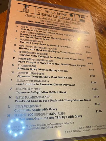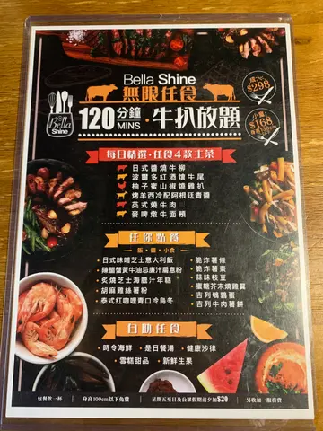 120分钟牛扒放题 $328 (已包加一),简直系食肉兽嘅天堂!日式酱烧牛柳肉质鲜嫩,带有微妙的甜味,入口即化。麦啤炖牛面颊浓郁的啤酒汤底炖煮,肉质软嫩,滋味十足。烤羊西冷配阿根廷青酱羊肉烤得刚刚好,搭配著香气四溢的青酱,口感和味道都非常棒。泰式红咖哩青口冷乌冬系清新的口味体验,咖哩的香辣风味和乌冬的弹牙口感完美融合。陈醋蟹黄牛油忌廉汁扁意粉扁意粉的醇厚忌廉汁与蟹黄的鲜味交融,味道丰富。吉列鹌鹑蛋鹌鹑蛋为主角,口感鲜嫩,搭配著绵密的蛋液,美味可口。脆炸薯条脆炸薯条炸至金黄酥脆,是完美的开胃小食。蜜糖芥末烧鸡翼甜中带点微辣,口感鲜嫩多汁。…查看更多