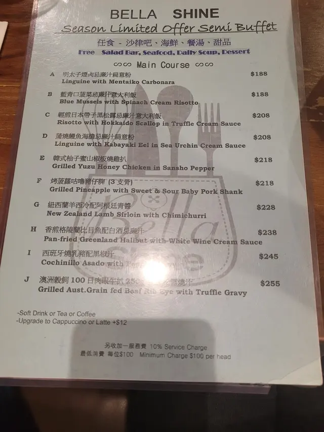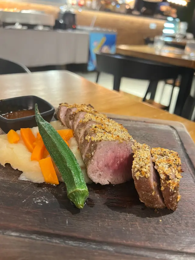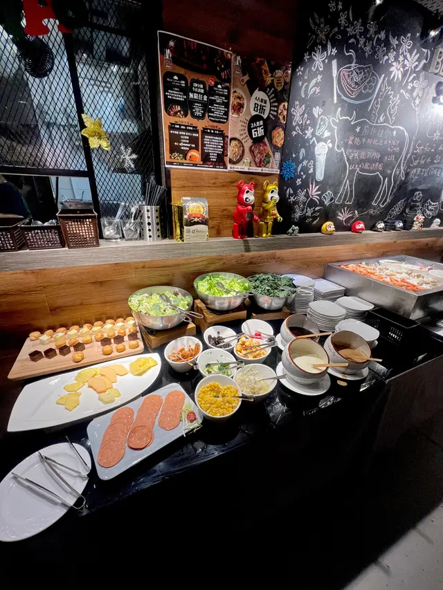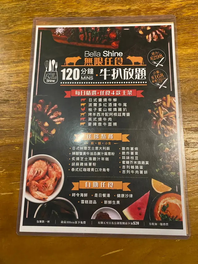120分鐘牛扒放題 $328 (已包加一),簡直係食肉獸嘅天堂!日式醬燒牛柳肉質鮮嫩,帶有微妙的甜味,入口即化。麥啤燉牛面頰濃郁的啤酒湯底燉煮,肉質軟嫩,滋味十足。烤羊西冷配阿根廷青醬羊肉烤得剛剛好,搭配著香氣四溢的青醬,口感和味道都非常棒。泰式紅咖哩青口冷烏冬係清新的口味體驗,咖哩的香辣風味和烏冬的彈牙口感完美融合。陳醋蟹黃牛油忌廉汁扁意粉扁意粉的醇厚忌廉汁與蟹黃的鮮味交融,味道豐富。吉列鵪鶉蛋鵪鶉蛋為主角,口感鮮嫩,搭配著綿密的蛋液,美味可口。脆炸薯條脆炸薯條炸至金黃酥脆,是完美的開胃小食。蜜糖芥末燒雞翼甜中帶點微辣,口感鮮嫩多汁。…查看更多
