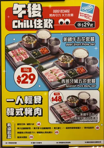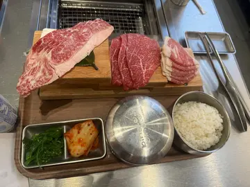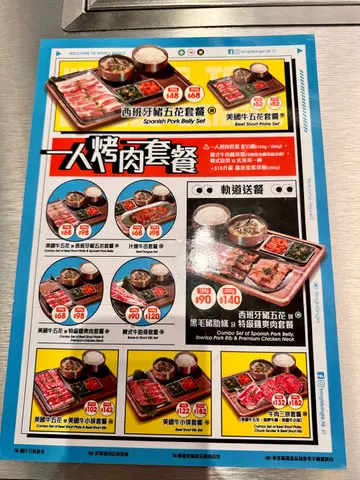 平时好少拣食烤肉,一来怕油烟多,二来觉得要烧好耐先有得食,不过今次呢间舖头嘅体验就唔错餐牌嘅选择都几多,一个人食可以拣几十蚊嘅套餐,多人食或者想食好啲,都有啲靓啲嘅肉可以拣而且餐牌有写明肉嘅份量,可以自己衡量下想食几多呢度好多嘢都系自助,加$12就可以任食白饭同配菜,仲可以任饮牛肉汤同饮品点完餐啲食物就会喺火车轨送过嚟,好方便又好得意汁烧牛舌套餐(200g)牛肉用烧汁调好味,就咁烧已经好好食牛舌有少少爽口,系我钟意嘅口感西班牙猪五花&肉黑毛猪肋条&特级鸡爽肉套餐(300g)一个套餐有三款肉可以食,而且份量都好多就算唔食牛都可以有选择牛肉三拼套餐(300g)一个套餐有哂牛五花,肩胛牛扒同五花肉虽然比另外𠮶两个餐贵少少,不过肉味浓厚,就算唔点酱汁都好好食呢个价钱食到咁好食嘅牛肉算系性价比高最钟意佢切到啲牛肉薄薄地,烧一阵就好快食得每个套餐都包埋白饭同牛肉汤,所以食得好饱整体嘅体验唔错,肉嘅质素都好好,下次可以再约朋友嚟食饭