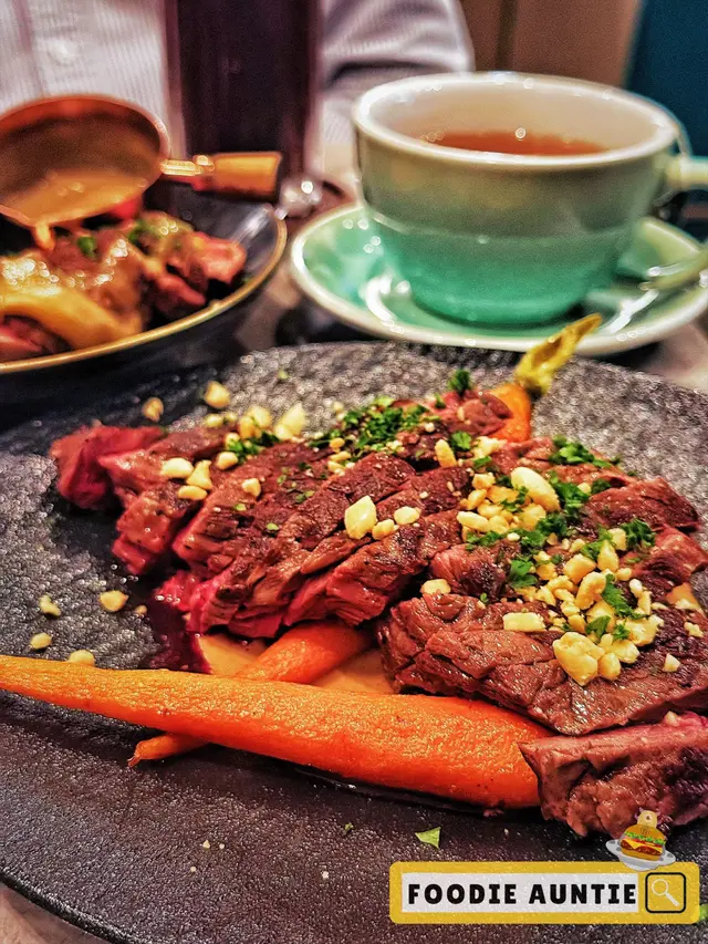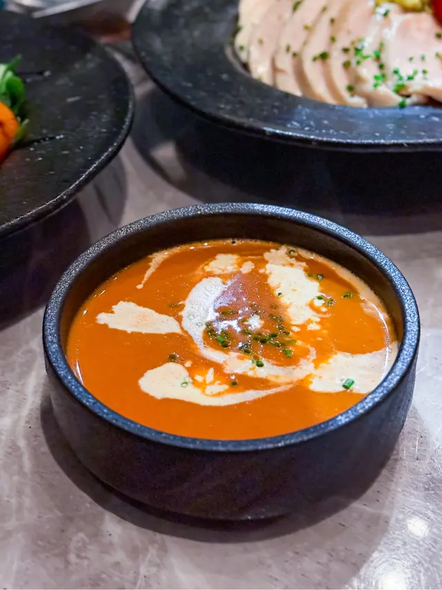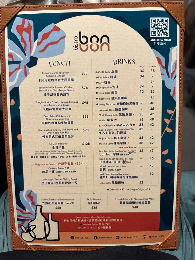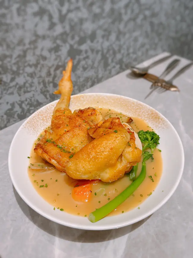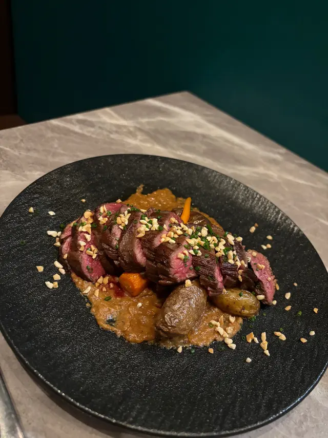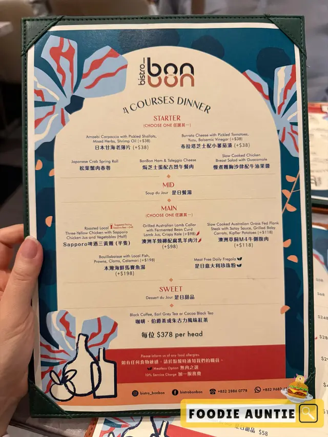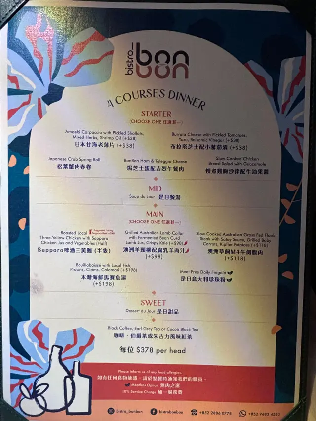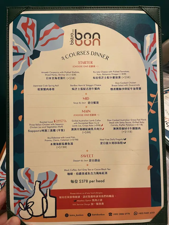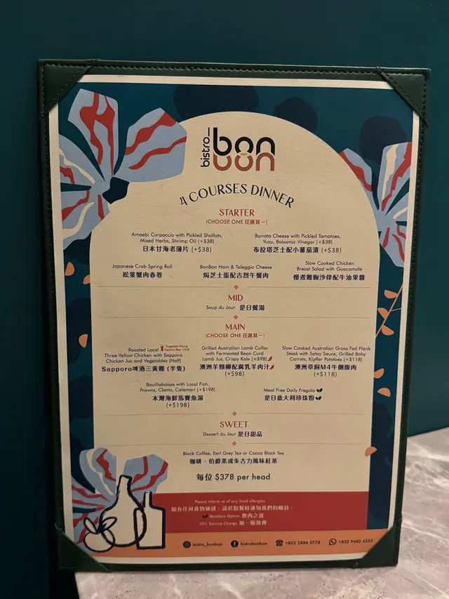 位於佐敦一家法式小餐館「Bistro Bon Bon 」,由擁有高級法國菜及日本菜經驗的主廚Mike領軍,善於將兩國菜系的技巧與新鮮食材結合,每道菜的配搭用心和有創意,味道會令人再三回味🫰晚市四道菜套餐由 $ 378起,包括前菜、主菜、甜品和飲品,而這個質素非常抵食,單食主菜已經值回票價👍✨Burrata Cheese with Pickled Tomatoes, Yuzu, Balsamic Vinegar (+$38)布拉塔芝士配小蕃茄漬|小蕃茄也用油漬方法處理,甜美多汁實在用心,Burrata用上意大利柚子蜜調味,令原本無味的芝士味道突出,配合芝麻菜和黑醋醬汁,非常美味開胃✨Japanese Crab Spring Roll松葉蟹肉春卷|酥脆外皮包上滿滿蟹肉,配上紫蘇葉和非常特別的鯪魚蛋黃醬,甚有港日風味,味道鹹香惹味✨ Soup du Jour 是日餐湯法式龍蝦湯|鮮美濃郁,帶有撲鼻的海鮮香氣,混合了龍蝦和蝦的鮮甜,湯底濃稠滑順,帶有奶油的醇厚感✨Three-Yellow Chicken with Sapporo Chicken Jus and Vegetables (Half)Sapporo啤酒三黃雞|驚喜之作,三黃雞特別肥美,雞皮酥脆肉質嫩滑,皮與肉中間帶有薄薄的的雞油脂肪,醬汁使用Sapporo啤酒和秘製醬汁調味,與三黃雞非常之夾,配菜有法式西蘭、薯仔和紅蘿蔔✨Slow Cooked Australian Grass Fed Flank Steak with Satay Sauce, Grilled Baby Carrots, Kipfler Potatoes (+$118)澳洲草飼M4牛側腹肉|牛扒生熟程度剛好,外焦內軟腍,肉質仍呈粉紅狀態,最特別係配上港泰式沙嗲醬,充滿花生香,配牛扒原來係咁好食,仲有配菜法式小紅蘿蔔和薯仔,沾上醬汁一樣咁正✨Dessert du Jour 是日甜品Espresso Mousse Cake 特濃咖啡慕絲蛋糕,質感厚實味道濃郁,充滿甘甜的咖啡香,好食✨Black Coffee|Cocoa Black Tea咖啡味道特別濃香,配上咖啡蛋糕非常夾超喜歡呢一杯「朱古力風味紅茶」,淡淡朱古力香,味道令人越飲越上癮…查看更多