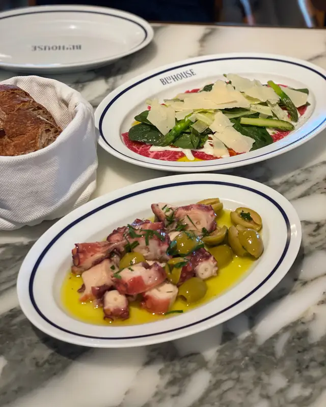最近去咗 BluHouse 食晚餐,整体体验非常满意。餐厅环境气氛好舒服,服务细心,节奏拿捏得啱啱好🙂↕️头盘点咗 Vitello Tonnato,牛仔肉切得薄又嫩滑,配上吞拿鱼酱味道平衡,带少少酸咸味,好清新。Polpo e Olive 嘅八爪鱼煮得啱火,质地软腍但保持弹性,配橄榄同少少酸汁,非常开胃🤤主菜试咗两款薄饼:Guanciale Pizza 香气十足,烟肉油香渗晒入饼底,边位薄脆中间烟韧;Quattro Formaggi 浓郁芝士味层次丰富,咸香但唔腻,芝士控必试🍕最后嘅 Tagliolini al Tartufo 系亮点之一,松露香气扑鼻,面条弹牙,酱汁收得滑而不腻,味道非常出色🍝整体水准高,食物质素稳定,价位中上但以用料同味道嚟讲相当合理,会想再去🥰…查看更多