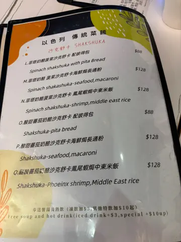 之前经过 见装璜别具特色 但撞巧有教会活动 包场 所以只能改天再来餐汤 - 红萝卜汤餐汤感觉舒服 唔似落好多添加剂 无味精/好重调味感觉但有好多红萝卜粒 而且有红萝卜本身的甜味 简单但美味 不错的水波蛋沙克舒卡牛肉中东米饭中东米饭 同 我地平时食开的饭口感唔同细粒啲 而且 唔硬 偏淋身酱汁 味道似蕃茄酱 酸酸地 亦有好多蕃茄碎粒牛肉一大块 唔会干净深同un 算滑菲塔奶酪沙克舒卡波菜鸡肉中东米饭一上碟见到好多波菜 因为加上酱汁 唔会好鞋口酱汁同平时白汁唔同 唔重奶味 但creamy 而且唔会觉得好济鸡肉比菜掩盖左 但其实分量都唔少总结价钱: 以色列菜 但唔贵 晚餐两个人食都够饱味道: 讲唔上惊艳 但舒服 十分推介 因为一般出街食饭都好油腻/ 落左好多添加剂/ 甚至预制食物 食完觉得个肚唔系几舒服 但呢度同一般的餐厅唔同 感觉材料天然简单 有自家感觉 但菜式特别 ! 亦适合有小朋友的家庭食环境: 布置精心 具特色感觉餐厅店主有用心经营 对客人询问都有耐心解答 会再到访 试埋餐厅其他特式菜…查看更多