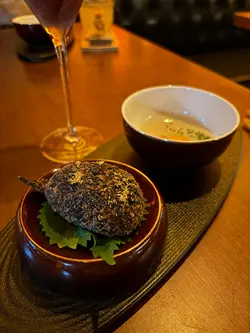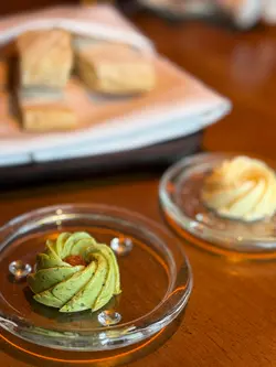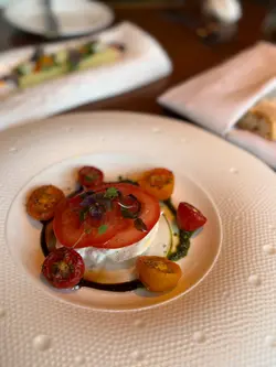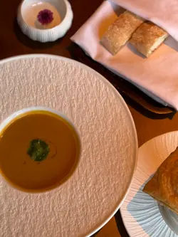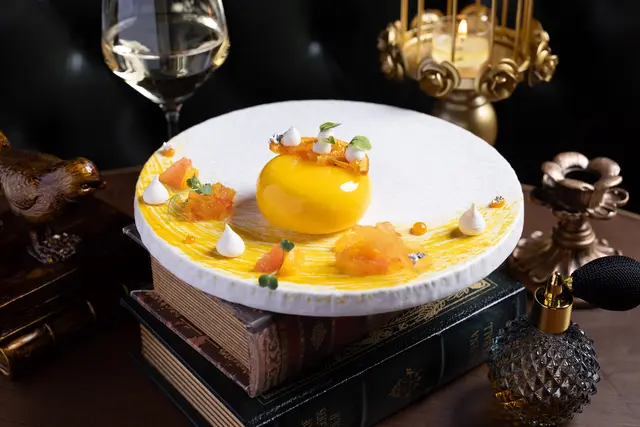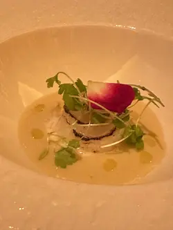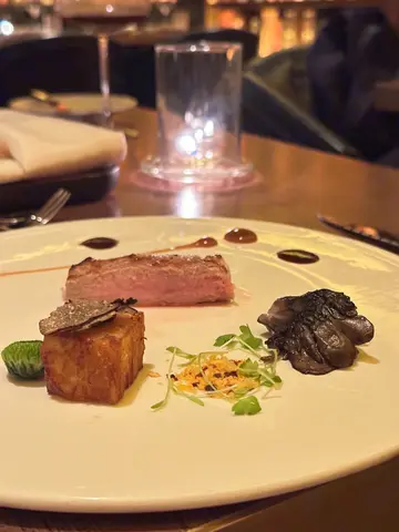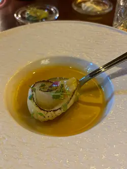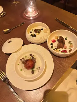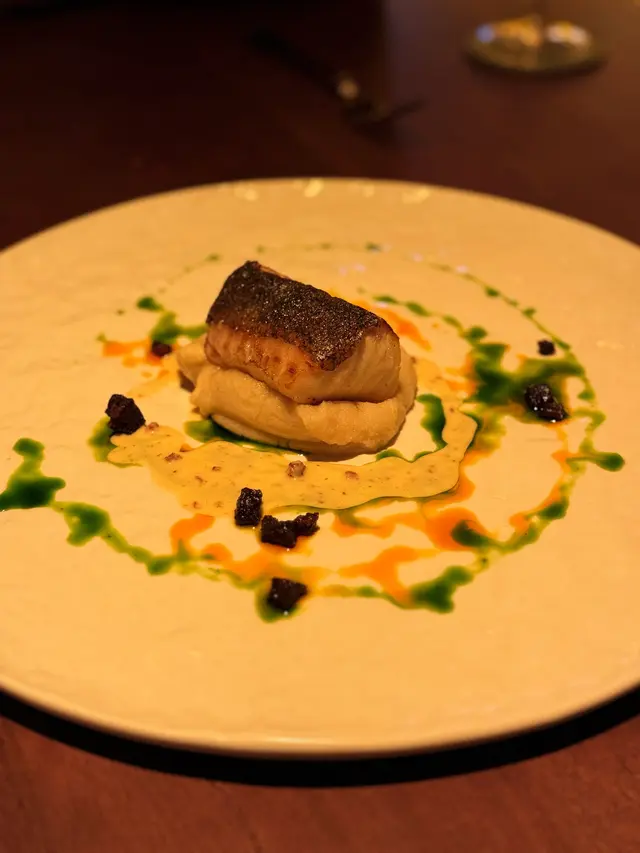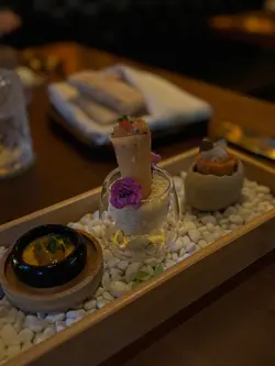 一开场就咁震撼!呢个海鲜三重奏用一个雅致嘅木盘盛载,好似一件艺术品!* 海胆脆筒🍦:迷你雪糕筒装住鲜甜嘅红虾tartare,口感又脆又creamy,超开胃!* 52度慢煮带子🍮:鲜味带子慢煮配上kimchi ,一啖入口,鲜味喺口腔爆发。* 墨汁海胆挞⚫:黑色嘅墨汁啫喱挞底非常Q弹,同软滑嘅海胆形成强烈对比,层次感十足!