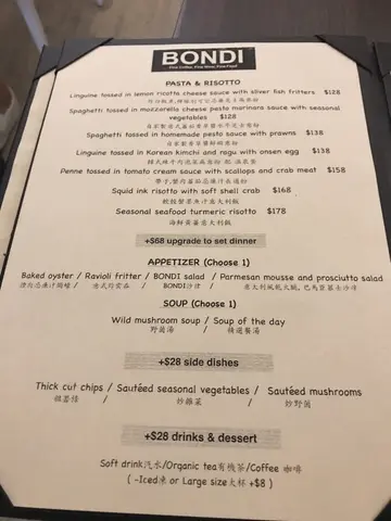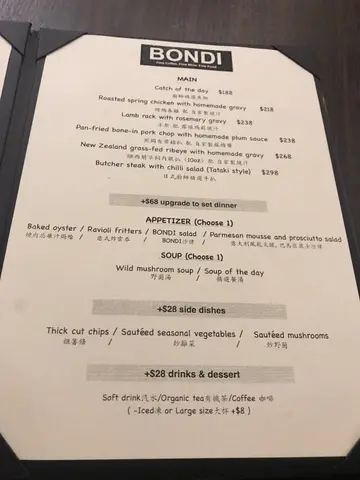 去完d2 place行完次次都唔知食咩,通常都系乱行揾间岩心水,咁今次就系地铁站附近既工厦见到有间叫bondi既西餐厅,咁就上去试下。环境几阔落又够静,几岩情侣黎食,首先先叫左个汤,好香好有菇味,然后重有个沙律,好足料,有我最喜欢既芝士酱加巴拿马火腿,我个人就最钟意食芝士酱,呢个沙律够哂多酱,生菜同火腿沾左啲芝士酱超好味。食完沙律开左个胃就准备食主菜,咁食西餐就紧系食排啦,叫左个五成熟既肉眼扒,好林,好有肉味,平时食排好惊好干好难咬,但呢度煎得岩岩好,好好食。最后就系甜品,心太软,好喜欢一叉落去有朱古力渗岀黎既感觉,而呢度既心太软甜而不腻,唔错,大满足…查看更多