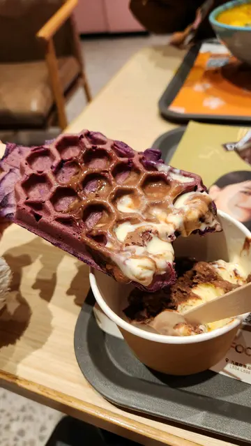 今日去左元朗yoho 既foodcourt 内食晚饭,食完晚饭觉得唔系好够饱,想食埋甜品😝见到有间Bove,之前系屯门市中心见到已经想食,今日试试佢!-心太软雪糕窝夫套餐($78)大概等左5分钟就有喇,本身套餐包左4件窝夫,一件心太软,一球雪糕,唔知系咪因为接近收工时间呢,店员话送多一球雪糕俾我,超级好😝个窝夫好好食,做得够脆,如果可以再多少少酱就好喇