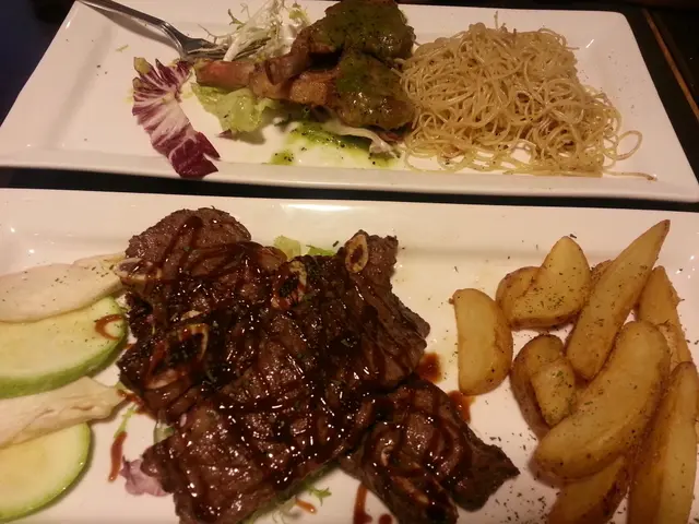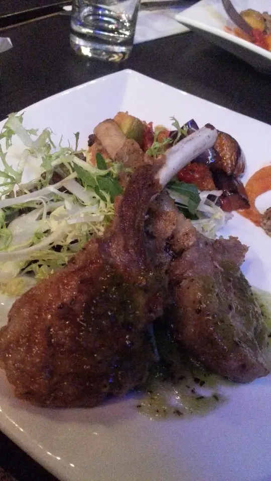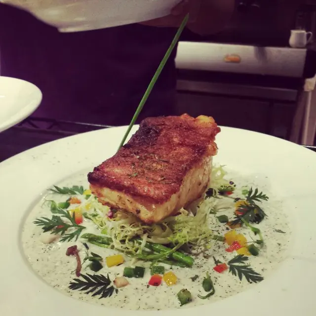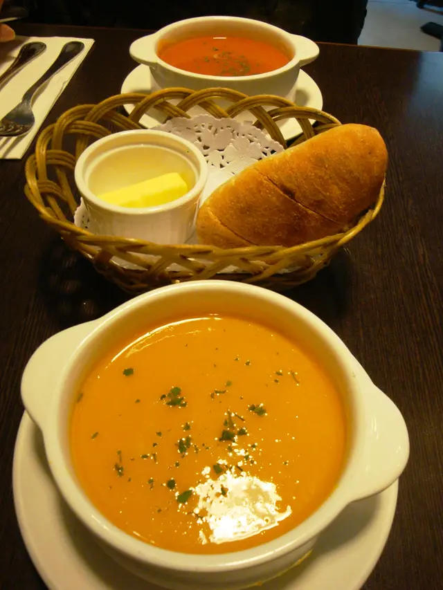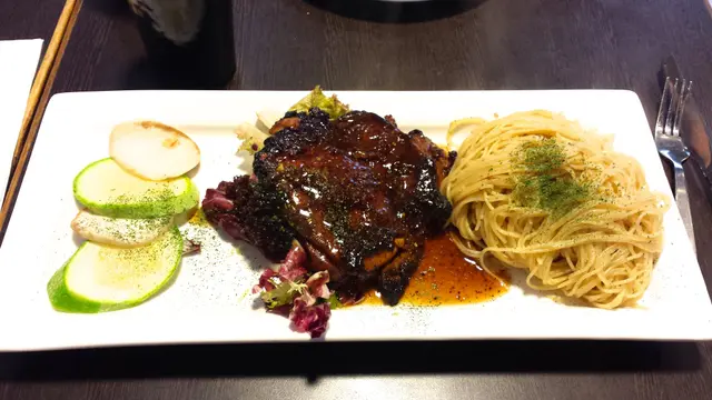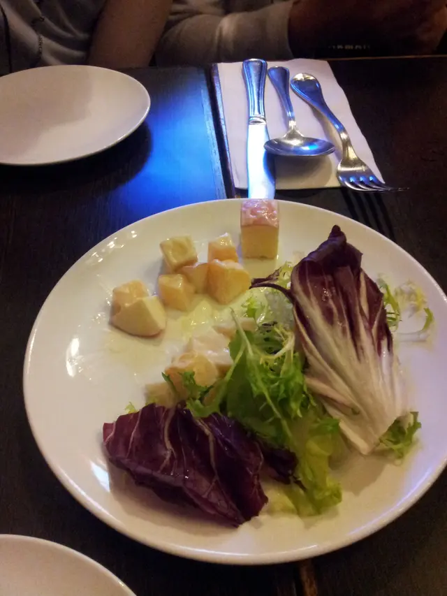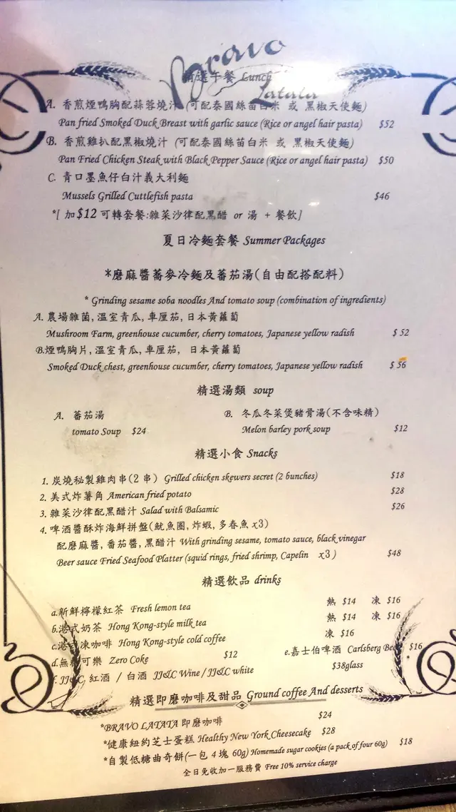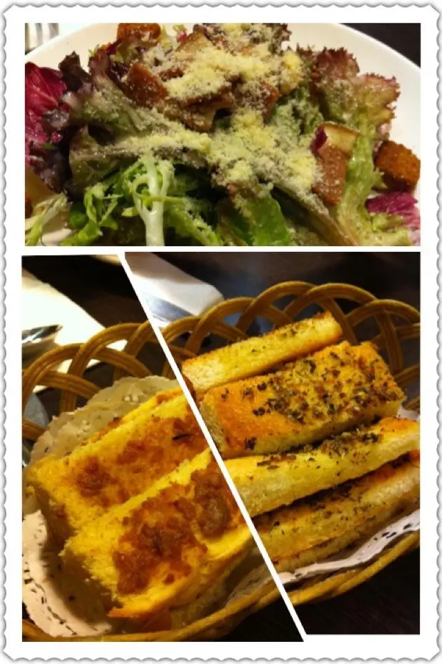 這邊人流不多,午飯時間都係冷清清的,好處是不用擔心冇位和被催埋單。Bravo Latata的門口用了紅白藍三隻色,幾搶眼,還帶點法國風情。裡面亦掛上不同的法國名畫,但不抬頭看的話,都是普通的旺角cafe裝修。選擇不多,有3個午餐和兩款冷麵。加$12就有沙律/湯和野飲。雜菜沙律都幾有趣,落左日式漬蘿蔔,除了黑醋之外,有另一種的酸味,而且好開胃。擺碟幾靚,由配菜一塊翠玉瓜一塊菇的擺法,感受到其他差不多質素的餐廳不會有的細心。份量超大