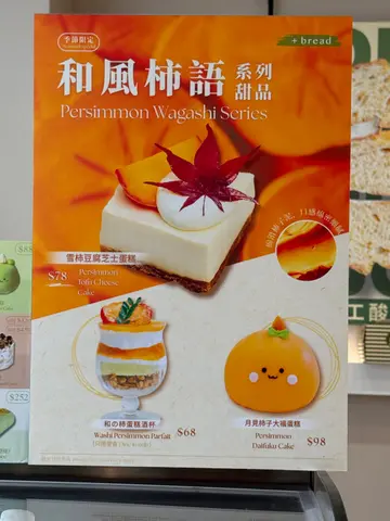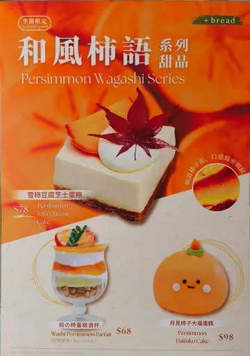 今日同几条港女去旺角行街, 行过见到+Bread 啲面包蛋糕卖相超可爱, 好吸引, 忍唔住入去打卡. 期间限定有3款柿子甜品, 出面好少见到有用柿黎做甜品, 咁创新又靓, 一于叫哂黎试. 再加2款cute 爆既包, 一齐share月见柿子大福蛋糕造形可爱爆灯, 外层麻糬皮烟韧,包住满满香甜柿子馅,蛋糕湿润香滑雪柿豆腐芝士蛋糕呢款蛋糕用豆腐芝士做底,口感清爽,唔似普通芝士cake咁腻。柿子果肉铺面,连皮食都唔涩,爽脆清甜, 成件事好清新。和の柿蛋糕酒杯用酒杯装,层次分明:最底层有D 燕麦片, 脆脆米粒之类谷物, 再铺上蛋糕+柿子果酱+忌廉, 口感丰富。🍠 芝士薯仔包啲包真系好得意, 好感度加100分. 外皮系微脆嘅欧式面包,入面包住芝士薯蓉, 薯味浓郁唔会甜, 同芝士味好夹, 质地好creamy 细腻, 又可爱又好食🥔 芋泥麻糬日式面包芋泥香滑, 味道自然无添加,麻糬烟韧唔痴牙,面包好松软, 唔死实, very nice🍵 日式培茶拿鐡培茶香气浓郁,奶味同茶比例刚好,唔会互相抢味。呢杯好啱食甜品叫, 食咁多都唔觉得滞拿鐡鲜奶咖啡钟意咖啡既朋友可以拣呢杯, 咖啡味几浓郁, 但唔苦涩.+Bread 出品真系有心思,唔单止卖相吸引,佢哋主打低糖低油,食落冇负担之余又好食, 仲有得打卡呃like, 正呀!…查看更多
