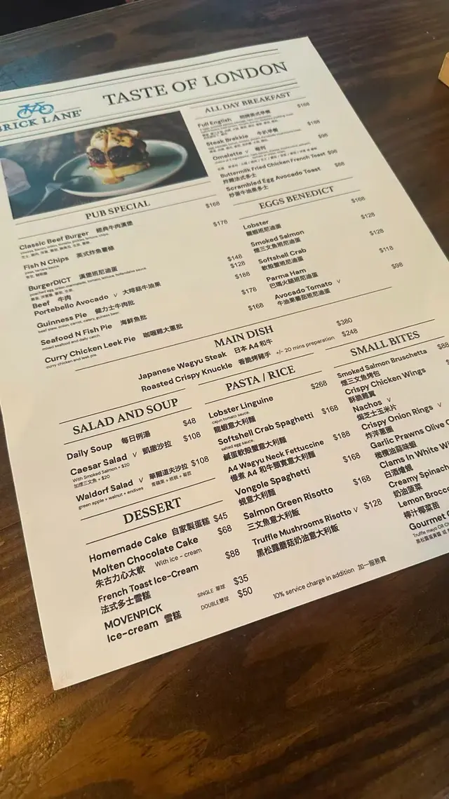 還記得讀書時期已經聽過走英式路線的Brick Lane,時至今日品牌依然存在,今天終於可以一試。本以為餐廳只有單點餐牌,原來也有午市套餐供應,價錢比單點實惠,而對個人來說餐牌上的食物也很吸引。與沙律中我選了餐湯,是日款式為甘筍忌廉湯,喜歡餐湯非常夠熱,紅蘿蔔味香甜,適量的忌廉令口感更滑又不會太膩,而旁邊的脆麵包香脆好吃,跟餐湯很夾;個人覺得加入適量的黑胡椒更能帶出餐湯的風味,然而為這頓午餐開了一個不錯的頭。個人比較貪心所以要了一客招牌英式早餐($148),勝在可以一次過嚐到不同的食物。約克郡布丁鬆軟不油膩、沙律菜清新新鮮、薯餅香脆、把跟餐湯配有一樣的麵包沾著水波蛋汁吃十分滿足。不過有部份食物的表現則比較遜色,例如煙火腿太鹹、煙三文魚的質素不佳,對於兩者都建議餐廳需檢討一下來貨;但整體上食物均有用心製作,難怪多年也屹立不倒。餐飲跟配茶或美式咖啡,加$20可升級至其他大部份的飲品,而我的牛奶咖啡表現正常,食物質素的印象比較深刻。餐廳的環境寬敞,有些食客在這裡跟朋友相約聊天,又有客人在工作,感覺這裡是一個不錯的空間,加上食物的表現,絕對可以回頭