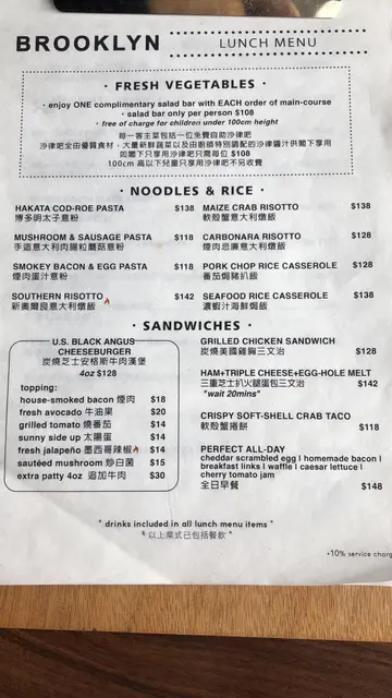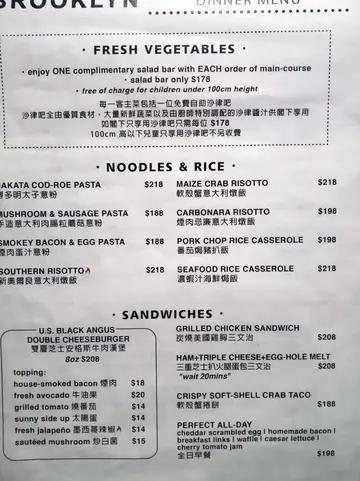 环境舒适 音乐不太大声 但整体餐厅灯光偏暗店员服务态度较hea吃了Brooklyn三年 第一次写食评 见证它的加价😂 餐牌变动 由普通沙律前菜变自助沙律吧 serving plate由黑色iron skillet变银色餐碟博多明太子意粉 $138普普通通 明太子味不够浓烈 有少量三文鱼子和少少量海胆 (海胆吃不惯 以为自己吃一整个渔市场落肚) 量少 但有自助沙律吧填肚子炭烧美国鸡胸三文治 $128没有拍照💁🏻♀️ 但卖相很不错鸡胸有炭烧的格子纹 吃得到炭烧味(其实我也不知道甚么是炭烧味 但隐约就是有那股味) 肉完全不柴 非常juicy 腌得入味 我就觉得有点点咸 非常适合重口味人士 比较特别是中间有半个切片牛油果及羽衣甘蓝 没有薯条之类的伴碟(沙律吧有!)自助沙律吧🥗单点沙律吧$108 但$118就己经有甚么软壳蟹包 所以不用我说 你也知道我想表达甚么吧😏沙律菜有三四类 但看起来不太新鲜 🥫有酱!八大种耶!🌽有水果!菠萝!🥓有肉!salami!🧀有芝士!大大粒巴马臣 车打芝士碎(伴沙律用) 🍘有炸物!普通薯条 黑松露粗薯条 炸鸡(脆但是是硬的脆🌽有淀粉!粟米粒(应该是罐头的) 蒜香多士(配汤吃)🥘有汤!蘑菇和(好像是)蕃茄种类少 但胜在样样都啱食 啱我食🥴…查看更多