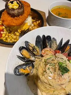 观塘B出口 的成业工业大厦227室Bubble Tree店内水泥墙配木桌椅,超有氛围,桌距宽敞不挤。服务员带位到介绍菜色都超有耐心,赞!抹茶鲜奶绝对亮点!翠绿抹茶拉花心形,香浓不涩,奶泡绵密,每口都爽!主食推蓝青口蒜香白酒意粉,攞盘漂亮,淡菜新鲜爆汁,忌廉酱浓郁不腻,裹满每根面。招牌菜:飞驒牛汉堡滑蛋盖饭,外焦里嫩肉汁多,滑蛋软绵咸香,配菜层次丰富,铁板滋滋上桌超有仪式感。甜品心太软配雪糕完美收尾,流心朱古力热呼呼,搭香草雪糕冷热撞击!人均120蚊,高质又超饱,会再访,试下汉堡同沙律,见好多人食!…查看更多