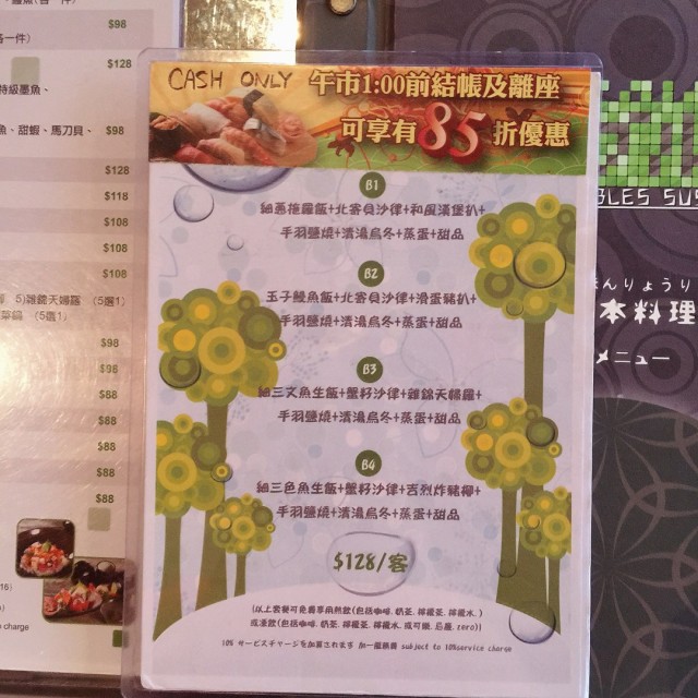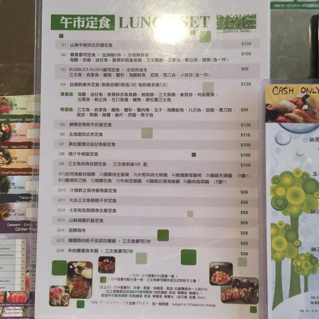 同朋友们在湾仔食个日式午餐Bubbles Sushi一定系质素保证一个寿司LUNCH SET $118跟餐有沙律蒸蛋面豉汤最钟意佢食落滑嫩既蒸蛋即使要加钱笔者都绝对乐意八件自选寿司再跟三件加州卷款式多到心思思唔知要几款好鱼生食落够哂FRESH 啖啖滋味仲要有个冷/热乌冬 热既够哂冧身滑口包你一定钟意!…查看更多