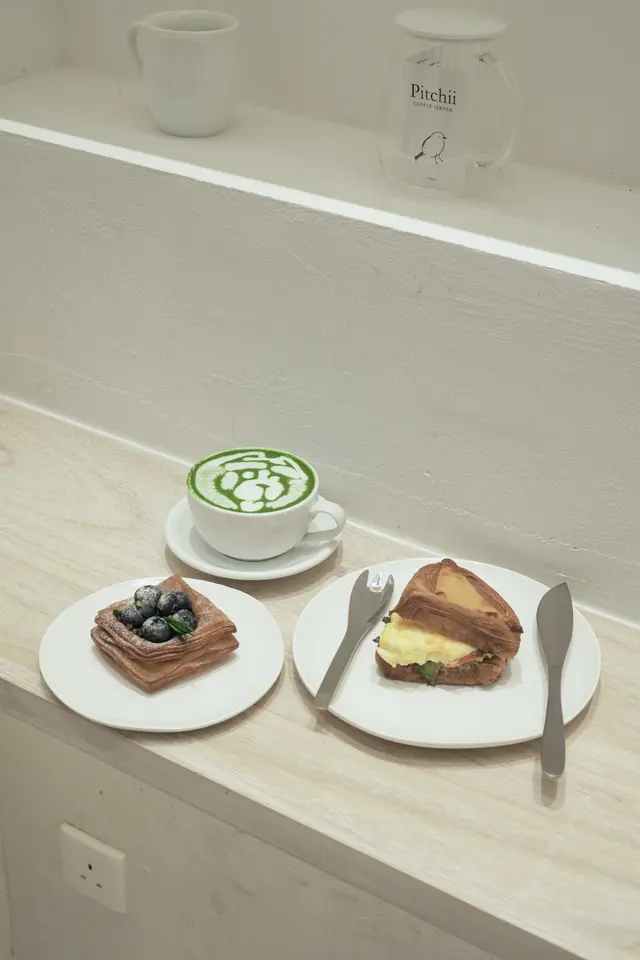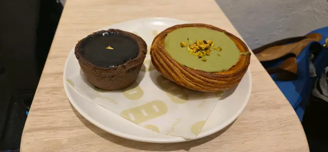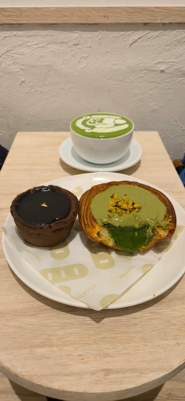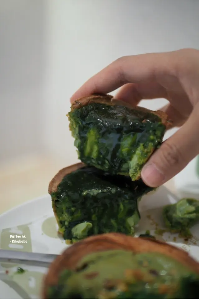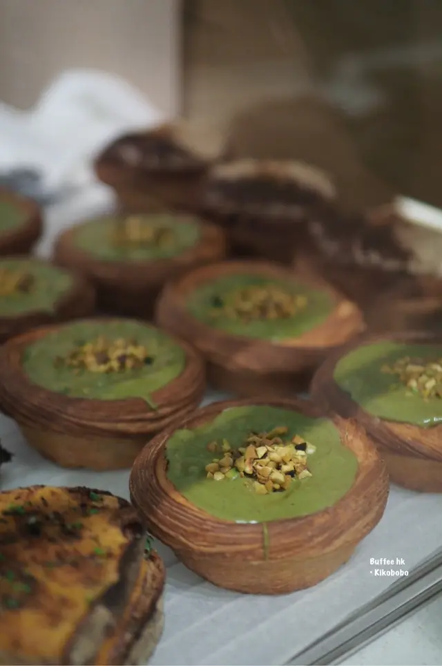 剛開業的Buffee人潮不斷,經過一段日子之後終於沒那麼擠擁,我們可以慢慢呷一口抹茶和吃個包包/甜點了。星期日的中午來到,店內客人不多,我們點了: 小山園抹茶撻,開心果流心酥,前者是就是抹茶蛋撻,蛋漿抹味不重,主要是面層的甘納許醬比較濃抹,曲奇皮鬆化,對我來說很可以😌甜度抹度也拿捏得不錯。後者是我知悉開店以來的目標(沒有之一),看見大家吃的相片非常吸引,開心果醬超級流心,酥皮也是酥脆得來不油不膩,開心果堅果的香味濃,麻糬下面好像還有一層法式杏仁奶油底?!夾雜著一點點開心果碎,味道比較複雜帶層次,我比較喜歡,早前在享樂烘焙店買到的開心果千層蛋撻,感覺上是比較單純的開心果味,而開心果流心酥的甜度也稍甜。飲品方面,我們點了丸久小山園-若竹,和山政小山園-松風,後者入口比較醇厚濃稠,回甘味重。後記:其實兩杯抹茶肉眼看分別不大,而當天我轉了soy milk,同行妹妹轉了oats,看見店員一邊談天一邊沖泡,之後也沒告訴我們哪杯是哪杯?當我問哪杯是oats,她還好像說了句忘記了轉(不太確定)😕山政小山園松風 $70丸久小山園若竹 $60小山園抹茶撻 $28開心果流心酥 $42…查看更多