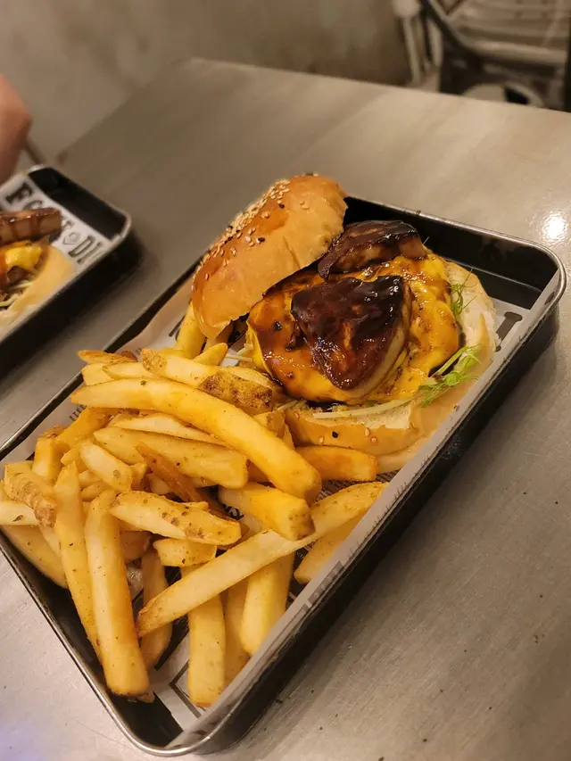 雖然呢間係漢堡店,但佢都有提供小食、意粉等既選擇,仲有生酮漢堡同甜品架~至尊漢堡 🍔雙層牛肉,仲有芝士/煎蛋/煙肉/紫洋蔥/蕃茄/生菜,超級豐富😍牛肉漢堡juicy有牛香味😚大份到2個人share都夠食😝另外都推介佢既花生醬漢堡🥜😎HKD118美式BB春雞配薯條 🍗🍟雞不可以貌相,望落炸得深色左啲好似會乾咁,點知唔係😲炸皮鬆化,雞肉嫩滑有肉汁,仲有啲香料味~如果雞味出啲仲好🙈已經切開左雞翼/雞脾/雞胸,仲有手套方便食👍🏻薯條好夠粗有好多薯仔肉🤤HKD80免加一服務費Burger's Friend Forever將軍澳查看更多