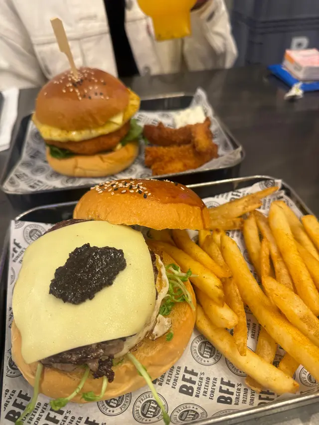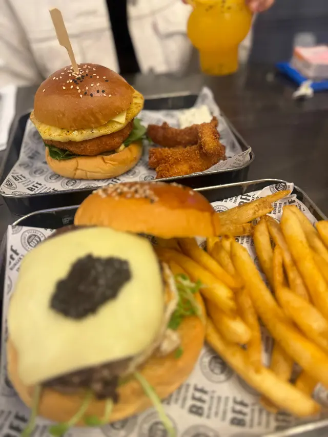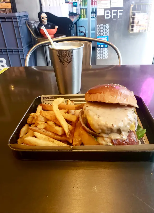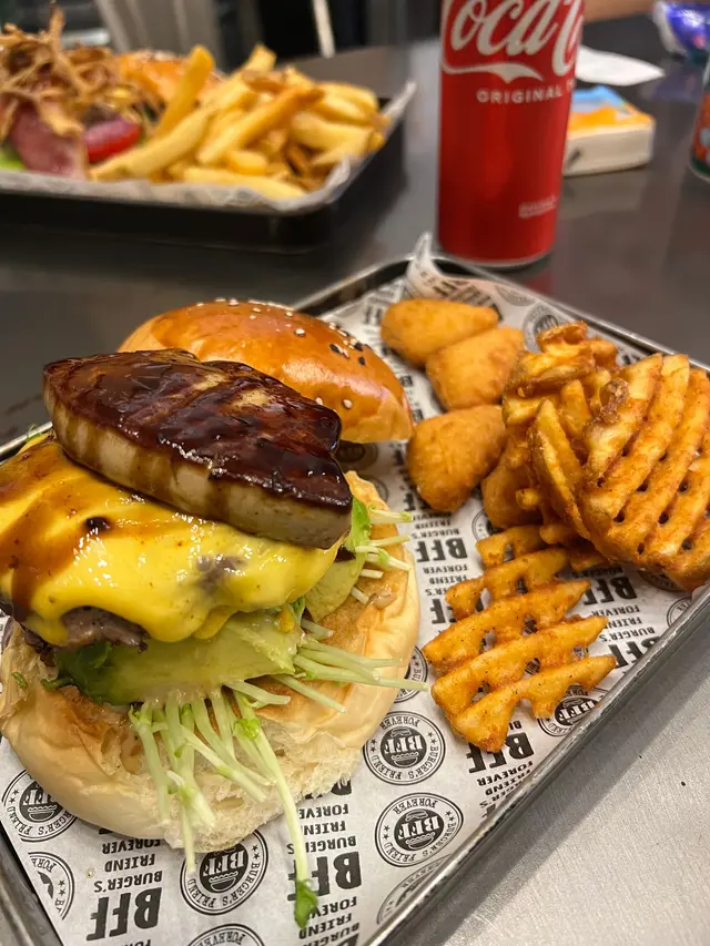 係BFF呢間食肆入面,我哋揾到咗一個超正嘅共啖經驗😋。首先,攻擊味蕾嘅係丹麥藍芝士漢堡,啖啖藍芝士,味道濃郁得來又唔會太腥,對愛吃藍芝士嘅我嚟講,真係正爆料啦!漢堡包嗰軟Cotton爛嘅感覺,啖啖肉汁四溢,令人一試難忘。而加埋旁邊嗰扎扎實實嘅薯條,外層金黃酥脆,入口即化,真係食不停口。跟餐嘅玉泉忌廉冰冷沁心,底下咁大熱天,真係消暑好選擇。再嚟嘅生酮牛油果安格斯漢堡則系健康得黎口感同樣一流。獨特嘅生酮包,帶點嫩香菜味,再夾埋啖啖肉質細嫩嘅安格斯牛肉同滑潤嘅牛油果,簡直係完美嘅組合😍。Oreo花生醬奶昔嘅話,無可挑剔,濃郁花生醬攞嚟同Oreo餅乾勁匹配,味道惹味又唔甜膩。至於芝士忌廉菠菜大啡菇就相對普通D,但都幾配漢堡,做個side dish也唔錯。吃完晚餐之後,唔知係咪感情暖笠笠嘅原因,我竟然覺得每一樣嘢都變得更加好味!拉鋸戰後,兩款漢堡剷皮,真係開心到不得了🤤。系食完,我啲心情就透心涼,絕對會再約埋三五知己,重游呢個美味嘅戰場。查看更多