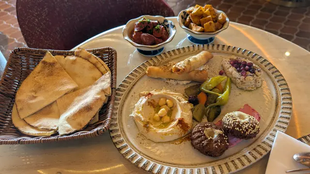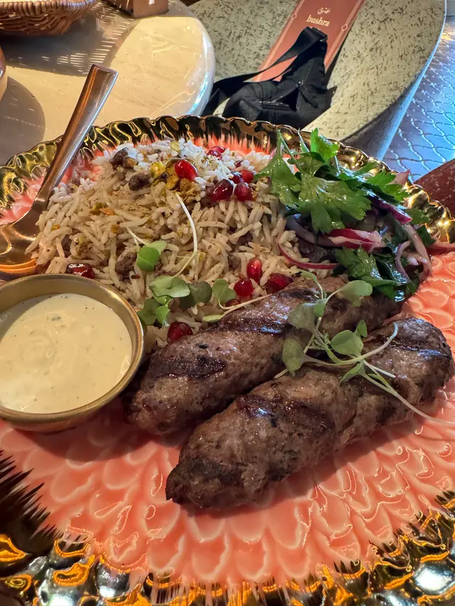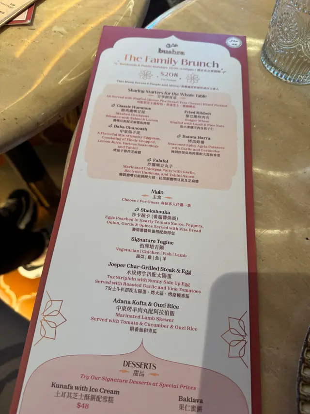 Middle Eastern cuisine is still relatively unfamiliar for most HK people. Having visited Bedu and Francis many years back, we both love the food very much, and I think it is only because of unfamiliarity many are hesitant in trying. When I heard about Bushra, located in TST East, has received some nice reviews, we decided to try it out.Occupying two floors in Tsim Sha Tsui Centre plus outdoor seating, the restaurant has access to the fantastic view of Victoria Harbour. We have opted to sit indoor because of the hot weather, the restaurant has comfortable banquette seats, trendy décor with a pinkish hue and plenty of Middle Eastern memento decoration the space.After checking with the staff, who made some recommendations for us, we decided to start with Bushra Mezze Platter ($198), which include Classic Hummus, made from mashed chickpeas blended with tahini, lemon juice and garlic; Muhammara, a blend of roasted red capsicums, pomegranate molasses, crushed walnuts and cashew nuts; and Baba Ghanoush, made with smoky charcoal grilled eggplant mixed with tahini. All of them are very flavourful and delicious, and I am more a fan of the Baba Ghanoush because of its fragrant smoky note. It comes with Pita Bread, and they are so good we ordered extra ones ($58) to finish all the dips. A must try.We also had Bushra Kofta ($248), with the ground lamb mixed with different spices before grilling to perfection. It is tender, juicy and moist, and served with flat bread and Arabic salad, together with tahini sauce. Another wonderful dish not to be missed if you like lamb meat.Finally, we have Chicken Kapsa ($248), which includes marinated roasted chicken (half) served with mixed nuts and Kapsa. In fact, the mixed rice dish is regarded as the national dish in all the countries of the Gulf Cooperation Council. The chicken is nicely done, but the rice is the true highlight, very flavourful, with raisins, pine nuts and almond slices supplementing some sweetness and additional texture.Service is good, with the staff friendly and able to make some great recommendations for someone like us who have very limited knowledge about the Middle East. Together with two beverages, the bill on the night is $1,063 which is also very reasonable. A great place to enjoy and experience what Middle Eastern cuisine can offer.…查看更多