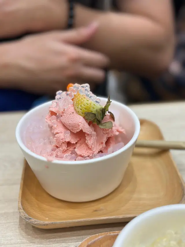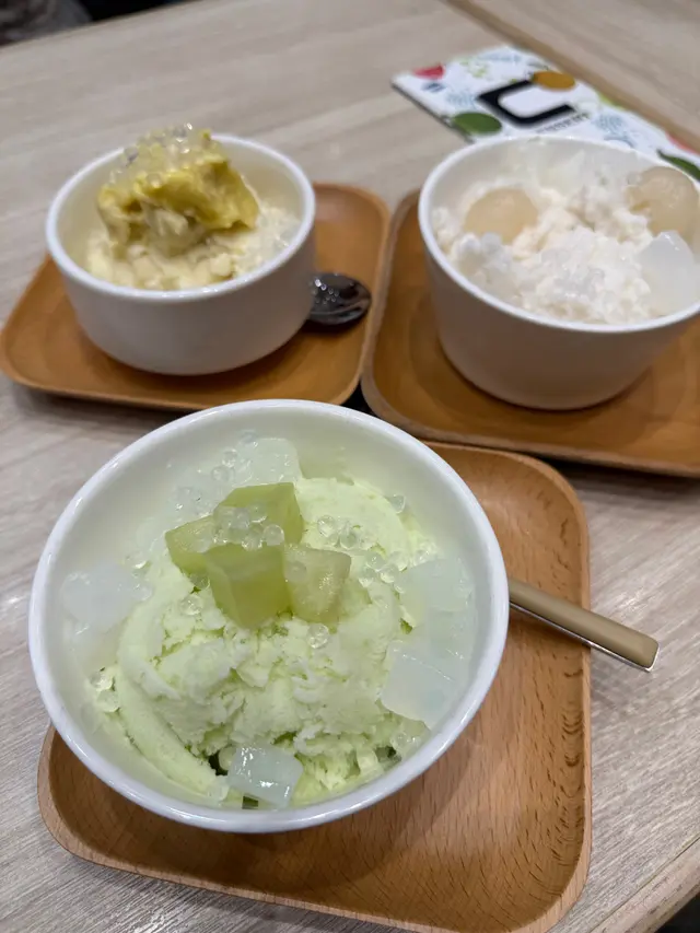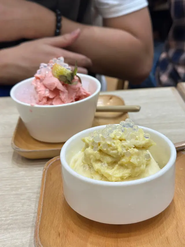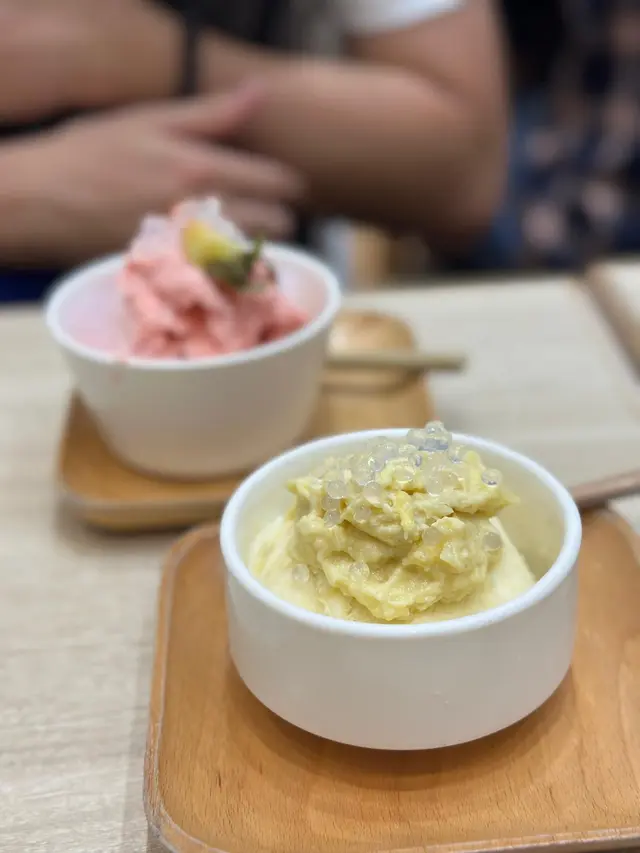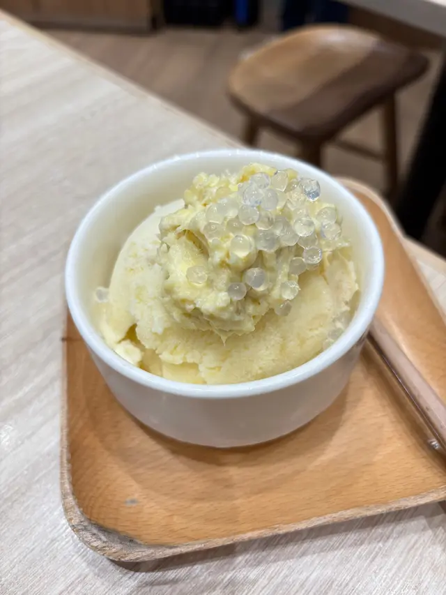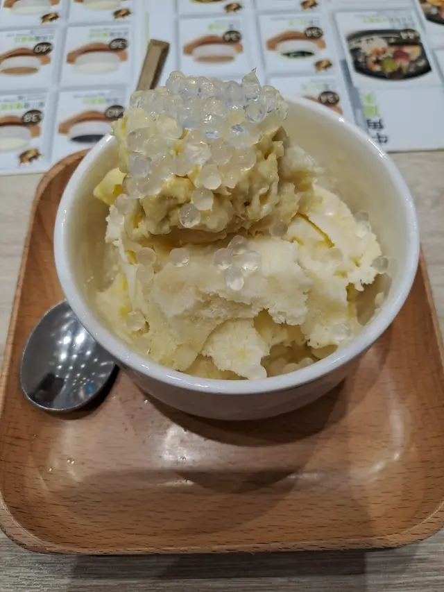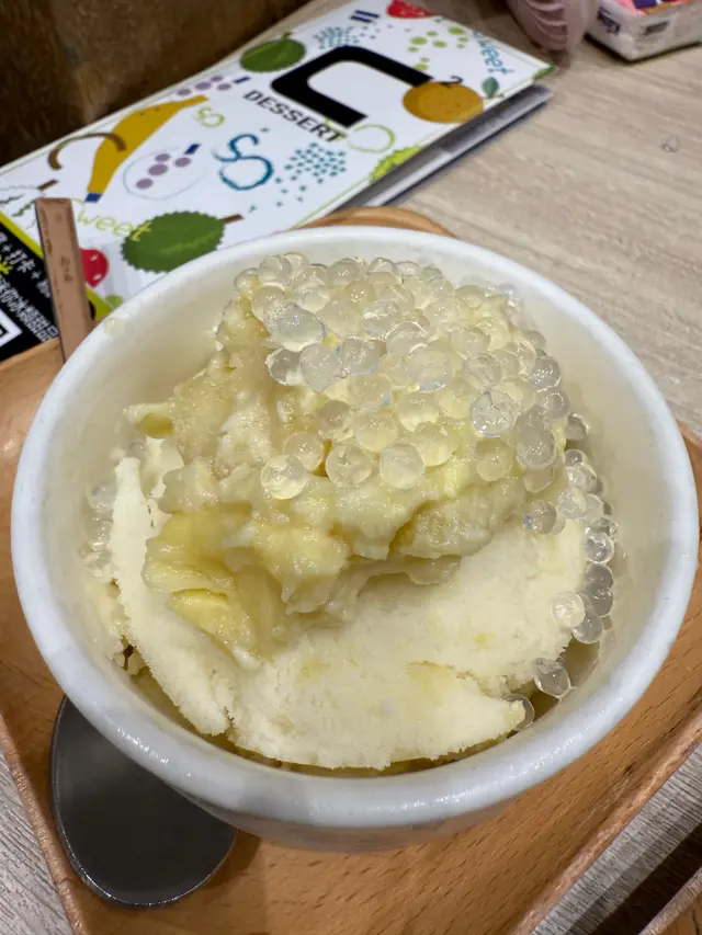 表面有一大球新鮮榴槤肉及西米,正啊!底下以榴槤冰作為基底,冰凍可口,沙冰當中加咗新鮮嘅榴槤肉,香甜味美