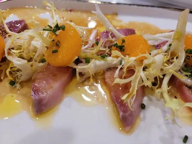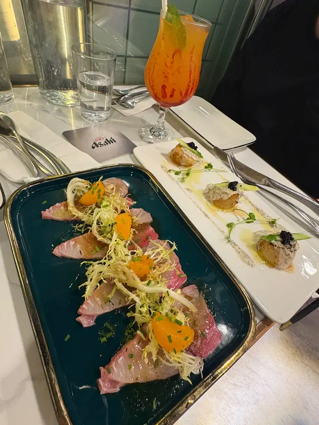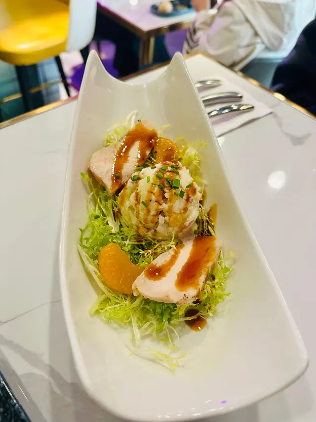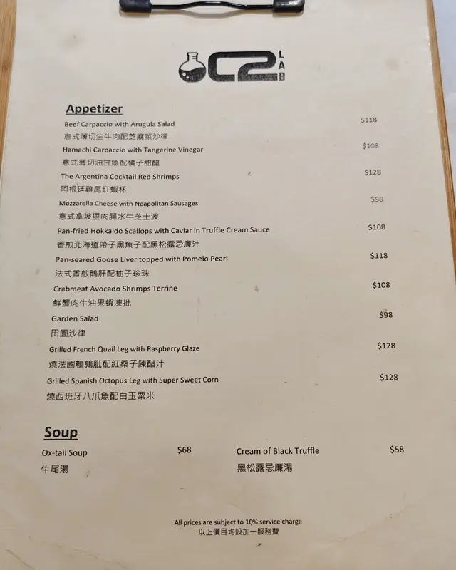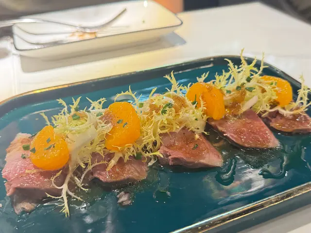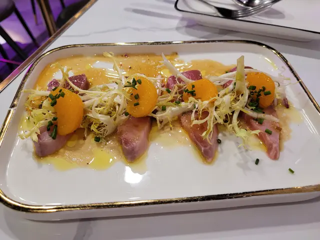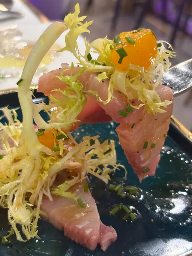 我同老婆都鍾意食油封鴨髀曾經食過好多間餐廳只有偶爾一兩間係滿意。呢間餐廳嘅油封鴨髀網上流傳係世一,幾年嚟都未有機會試,今日趁住結婚周年,預早訂枱日常呢個傳說中嘅名菜。由於見到前菜都好精美,而且餐廳做優惠,叫一個主菜可以用優惠價$88叫一個前菜,忍唔住叫咗四個嚟試吓。意式薄切油甘魚配橘子甜醋$108一般去食日本嘢都會叫油甘魚刺身,但係配上特製嘅西餐醬汁,令魚嘅鮮味提升咗,層次豐富咗,最神來之筆就係配上法國柑橘仔,唔酸之餘非常清新,如果夾埋一齊食令人非常回味。