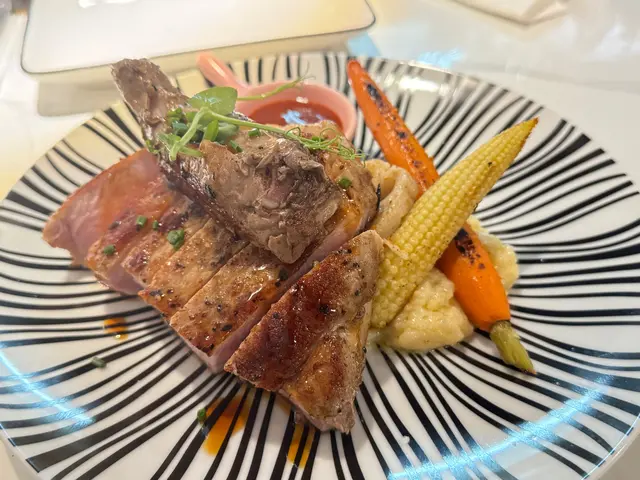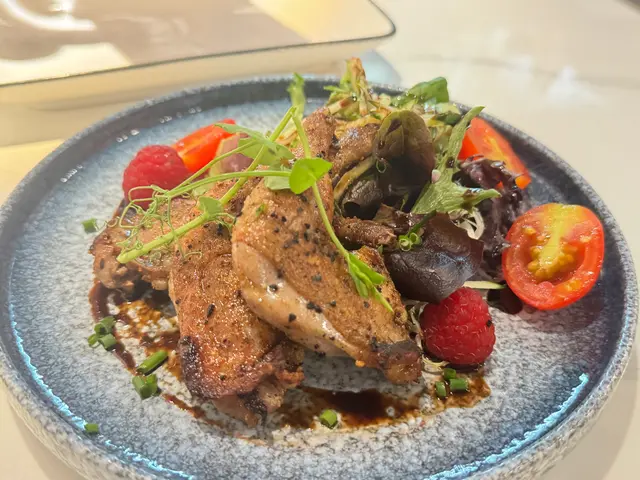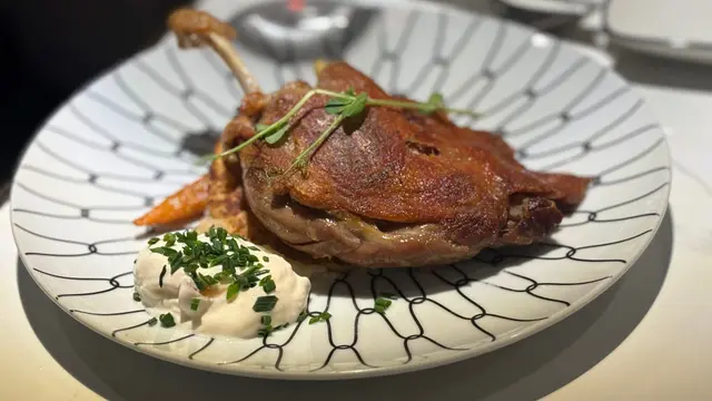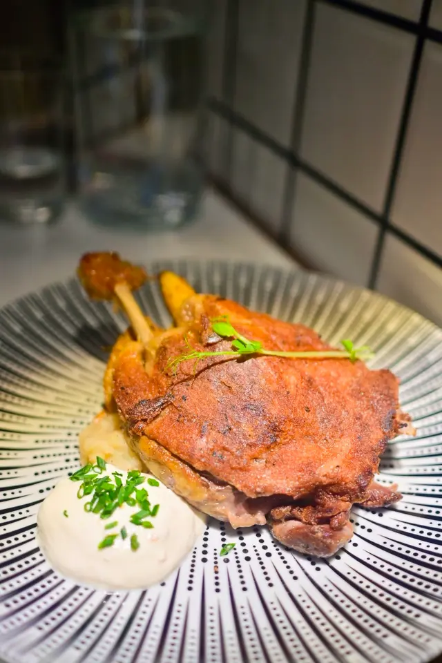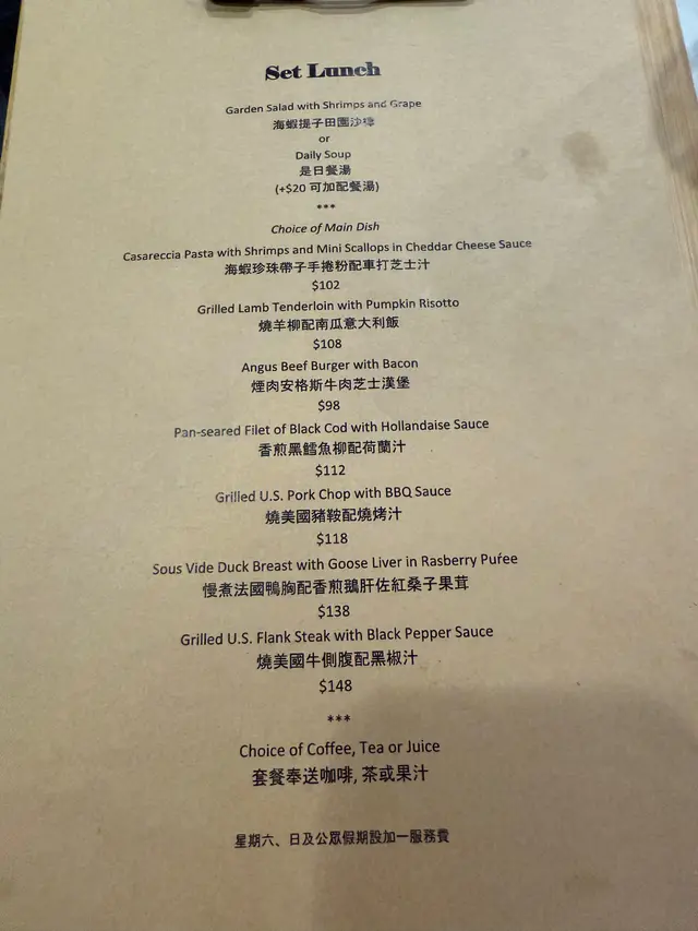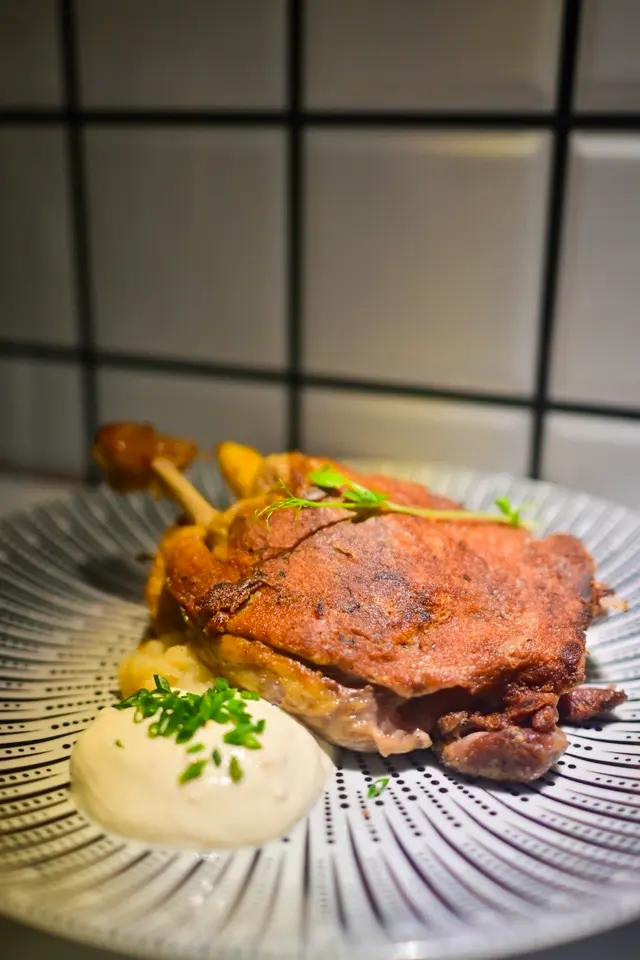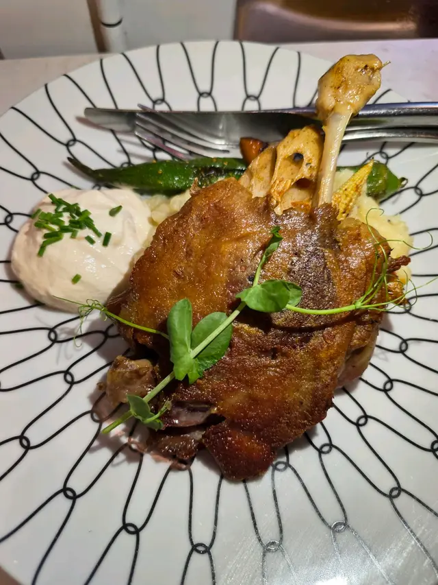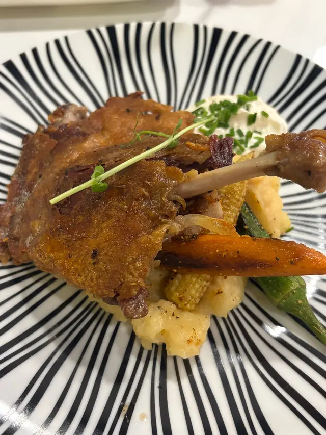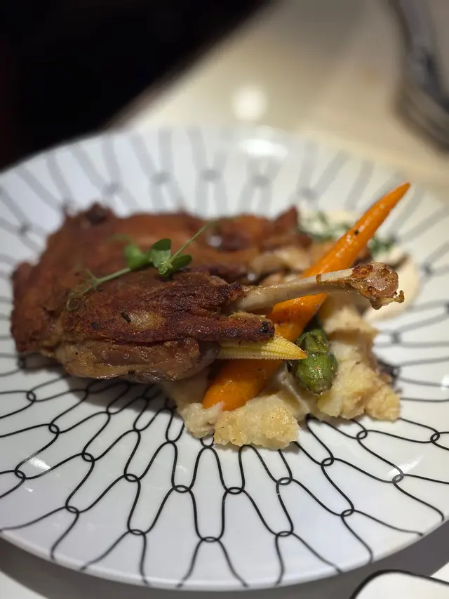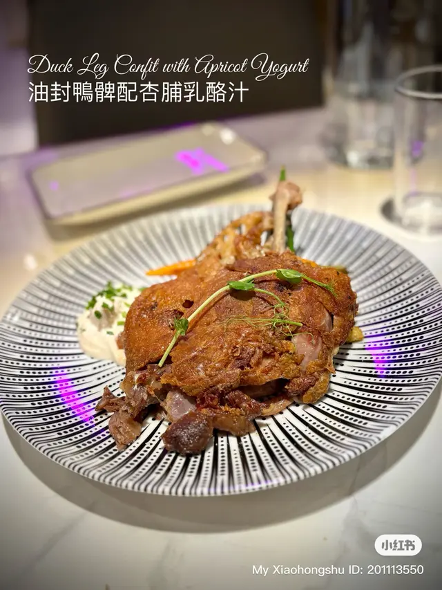 燒法國鵪鶉髀配紅桑子陳醋汁$88除咗去米芝蓮法國餐廳之外,我好少會見到餐廳提供呢個菜式,而且仲係當前菜食。鵪鶉髀燒得啱啱好皮脆肉嫩。蘸上意大利陳醋食,一啲都唔油膩,令人印象深刻。油封鴨髀配杏脯乳酪汁$238期待已久,主角終於出場!外皮煎得非常香脆,一啲都唔油膩。鴨肉本身已經醃過,烤焗得比較乾身,但食落一啲都唔柴,蘸上杏脯乳酪汁,微酸而帶清新嘅味道同呢個鴨髀,可謂絕配,難怪咁多客人慕名而來。
