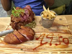 第二次光顾这店,上次午餐,今次晚餐。我们叫了肉眼扒和德国咸猪手,有汤、面包和餐饮。餐汤是罗宋汤,色味都略淡,不喝也罢。面包够热都ok啦。肉眼扒配饭,我叫了五成熟,但来的应该有七成。不过都不会太靭,而且都仲有肉汁,份量算大件。整体都几满意。另外叫了德国咸猪手配薯菜,是已起骨分件的。也可选择整只上菜。外皮相当香脆,而且份量十足,薯条是粗薯,卖相很吸引。惟酱汁太少,若要多取要加钱.我 本身不爱酸菜,所以不知道好坏,个人认为一般。这里点餐后,饮品任饮,有汽水、茶包、咖啡及朱古力等等。座位宽敞,闲坐或静静晚餐都很舒服。…查看更多