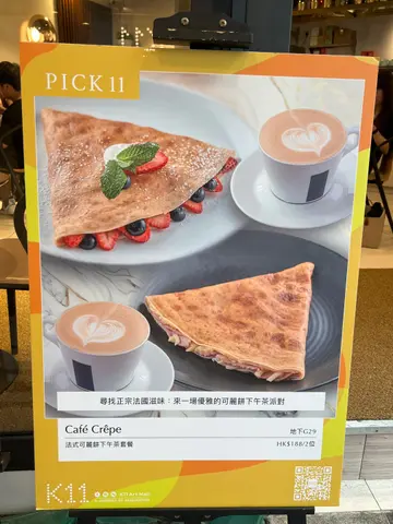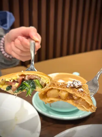 今日同朋友去回味下澳洲时食可丽饼的味道。原来这间店是来自加拿大。无论咸味或是甜味的可丽饼,都有超过十多款比你选择,还要是现场即叫即做。餐厅除了叫可丽饼,饮品亦非常多选择,有沙冰、奶昔、COFFEE 等。苹果金宝配奶油酱可丽饼 (甜味)我平时好憎食苹果批,但呢间做的金宝苹果可丽饼,馅料非常多,入面的烤苹果粒粒一D都唔酸,而且仲好爽口。奶油酱再加上香脆的金宝淋在可丽饼上,眼观已经超似一件艺术作品,还加上一球云尼那雪糕,真系如名画一样。食落层次十足,热中带冻,云尼那雪糕有加湿加味的作用、令可丽饼的味道更出。食完超满足。风干火腿布里芝士配罗勒酱鲜茄及蛋 (咸味)感觉系将平时的意大利粉,变成可丽饼咁食。风干火腿就好薄身、好香猪味。似食紧parma ham。芝士味好香浓令风干火腿更提鲜。可丽饼饼皮薄身,口感烟韧。黄金冰冰落饮落去有一阵姜味,饮完之后成身冻晒,果然好够冰。意式雪糕加特浓咖啡饮落去好香嘅咖啡味比较偏苦,唔会太甜最啱男士叫。上面旧雪糕好好食,唔会咁快溶,将杯咖啡加上一点点甜味中和咖啡嘅苦。可丽饼…查看更多