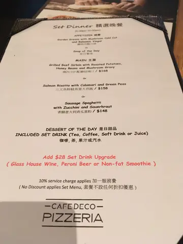 是日本身约食下午茶,朋友原来放5点。食咩好梗系靠open rice 。目标好快锁定~餐厅宣传够成功(早晚市65折)。事实上,本人都怀著战战兢兢心情去开餐;因为潜台词-边有咁大只夹乸除街跳嫁。虽然系咁谂,始终食左先讲。一坐低感觉同坊间pizza 店有相类似嘅感觉,无论系装潢同风格都如一般西餐食店,无特别惊喜。我地一行三人,试左两杯饮品,分别是