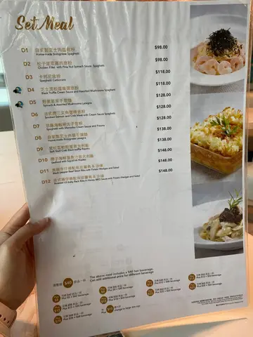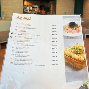忌廉海虾明太子意大利粉 / 自家制芝士肉酱千层面 / 黑松露软壳蟹意大利饭 / 美式猪仔骨配有皮薯角&沙律 / 烟三文鱼流心鸡蛋多士盒