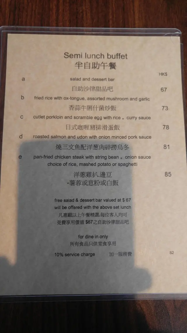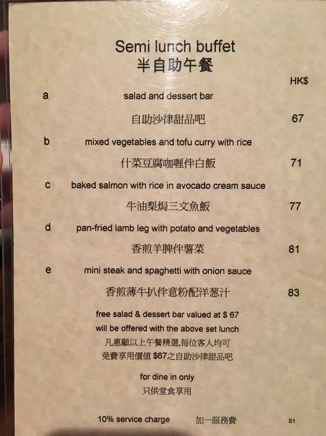 老尖幾間常常光顧的便宜美味聊天好聚腳食店經已買小見小,我為食仔當然感覺很無奈又不太開懷,經過老尖朋友介紹下,尋尋覓覓,周圍打聽,收到有間在老尖海傍鄰近文化中心,有間平靚正半自助午餐廳,價錢大眾化而又有多種選擇特色美味可口的套餐供應,最為有多類型田園沙律,任食任品嚐,味道新鮮,熱呼呼中湯及西湯,加上精緻軟綿的甜品,口感十足的糖水不停地供應,不僅如此,還可以在此店任食三小時!最重要就是與親朋戚友一路談天說地,一路品嚐各式各樣的沙律和味美的甜品,在一個環境尚算清靜,地方企理的餐廳,算是值得推介!义燒汁羊排伴意大利麵,賣相不錯,份量足夠,而又美味濃郁可口,其味好味,肉質嫩滑感覺非常非常滿足味蕾,簡單就是小確幸,心情自得其樂,享受美食是令人忘記憂傷,賞心樂味,快樂逍遙自在,正是這樣!又一個咖哩伴香脆魚排,其肉質彈牙,青爽爽口,大大件份量,一口一啖,既感味純而濃,十分香濃無比,最好加些伴菜就滿意!各種各類矜貴菜沙律,細嚐滋味,越嚼越甜,味道爽滑,有一種新鮮食材,令人富口感而特別,沙律加上芝麻醬更為充滿味蕾,美味美食就保持水準!美食當前,聊聊天忘記拍照,但此餐廳田園沙律款式惹味非常,一刻間都吃光,不太久侍應即時再添加食物,新鮮滋味的沙律又到為食仔喉嚨,滿足五臟廟,值得讚許!清甜香口的甜蜜餞杞子糕,甜味正宗,不太甜膩,製作簡單,軟軟棉棉,有彈性有口感,香氣甜甜,與眾不同的糕點!正是現今這個以人為食的價錢,是值得來光顧的餐廳!…查看更多