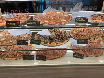 这款海鲜披萨看起来很丰富配料满满,有菠萝、番茄、红洋葱、虾、鱿鱼青花菜和起司,一口咬下去酸甜味道交错,还挺特别的。凤梨的甜和番茄酱的酸融合得不错,青花菜还带点脆口,算是加分。起司拉丝效果很好,满浓郁的,但饼皮稍微偏厚,吃起来有点干,感觉酱料可以多一点。整体来说,味道不错,还是值得试试!