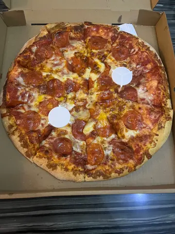 当晚见到门口排咗一堆人等紧外卖,忍唔住好奇走去睇睇,原来逢星期二有大批特价优惠,价钱唔使 $100,即刻决定一试!虽然因为优惠关系人流多,排队时间稍长,但职员依然细心讲解餐牌同优惠详情,服务态度非常之好,令人感觉亲切又有诚意👏。🍕我哋叫咗一个辣肉肠大批 Pizza,批底属于厚批款式,食落去烟韧饱肚,份量十足。🌶️辣肉肠微辣,味道惹味,唔会太咸;🧀芝士拉丝感十足,视觉同口感都满分。即使系外卖自取,返到屋企仲系热辣辣🔥,冇走样,口感一流。