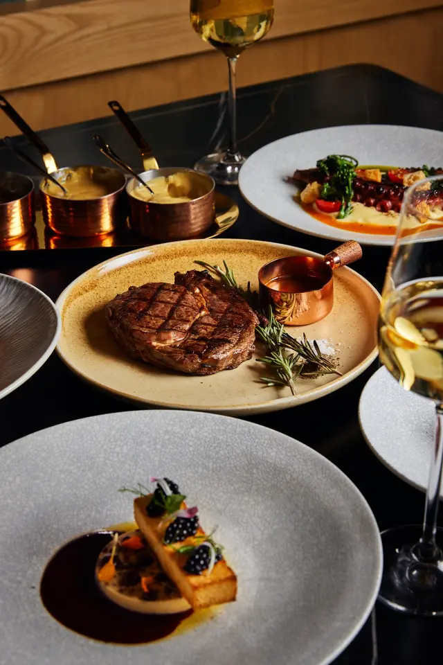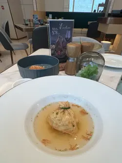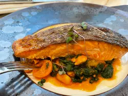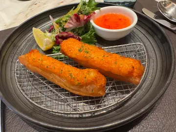 黄金福袋有惊喜感, 卖相精致, 外型似个金袋仔, 一上枱已经散发住香气~ 炸豆皮皮薄冇油腻感, 内层馅料丰富~~ 主菜我哋分别叫咗香煎脆皮三文鱼,鱼皮煎得好靓, 鱼肉保持到嫩滑油润, 冇煎过笼!!食落好清爽, 唔会觉得腻