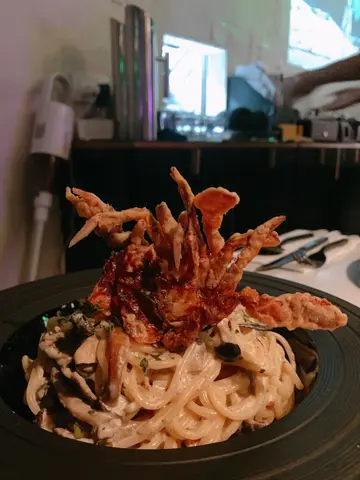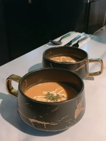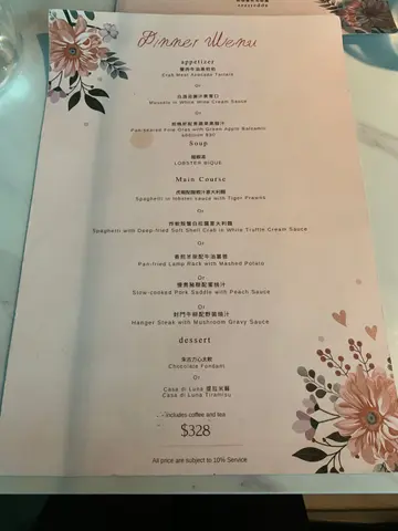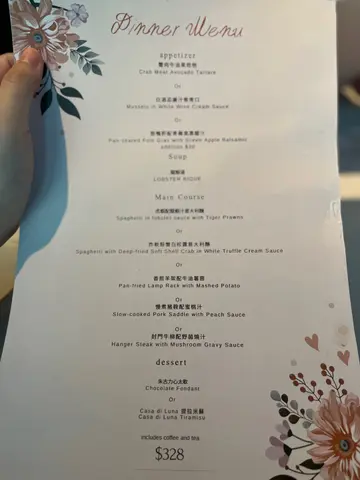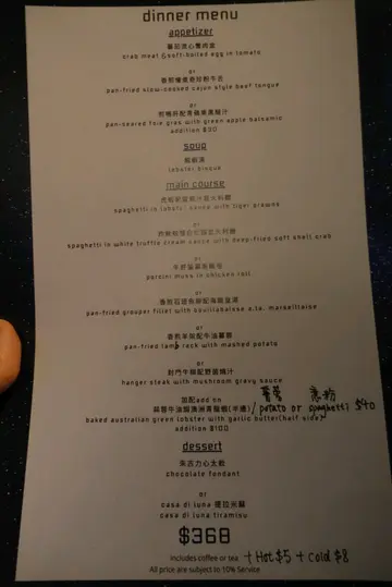 铜锣湾依间「Casa di Luna」以月球为主题,墙上有太空人画作装饰,天花板则布满月球灯,不得不说,依间真系人气餐厅,当日帮衬餐厅,餐厅系全场坐满之余,外面仲有人等位,但全场得一个楼面,不过𠮶个女Staff服务依然好好,略嫌晚市套餐只能够前菜或甜品之间二选一。*此餐厅收取加一服务费。晚市套餐(单点$328),封门牛柳配野菌烧汁,五成熟,封门牛柳肉质嫩滑,牛味浓厚,配以野菌烧汁食用,食落好惹味,略嫌野菌味道欠奉,薯蓉口感幼滑,配菜包括有芦笋、甘笋。晚市套餐(单点$328),炸软壳蟹白松露意大利面,软壳蟹口感酥脆,食落有鲜味,意大利面容易挂汁,略嫌酱汁白松露味道偏淡,主要剩系食到忌廉嘅味道,配料包括有杂菌。煎鹅肝配青苹果黑醋汁(跟餐$30),鹅肝口感厚嫩,肉质肥美,食落入口即化,配以青苹果黑醋汁食用,味道酸甜,配菜包括有法包、沙律。2碗龙虾汤(跟餐$0),口感浓稠,味道咸鲜,内有鲜虾,味道鲜甜。Casa di Luna提拉米苏(跟餐$0),表面铺满可可粉,食落好Creamy,手指饼部分食落有咖啡酒味道。冻柠檬茶(跟餐$0),茶味清香,饮落好清爽。即磨咖啡(跟餐$0),咖啡味道浓香,配以咖啡方糖饮用,饮落甜度适中。…查看更多