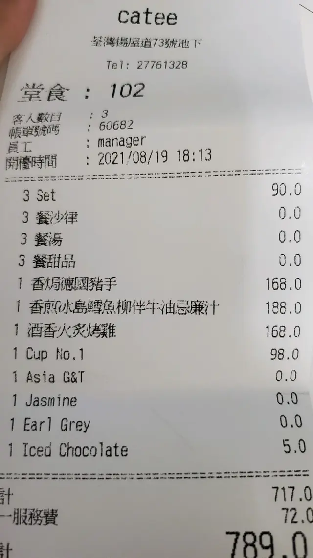 27.08.2021Catee約咗朋友暢談,很多食肆都限時1.5-2小時,所以上Open Rice終於揾到Catee,問咗無限時,而且話留卡位等我哋坐得舒服啲。去到餐廳,地方比預期中細,一入門只有兩張卡位,其他就是二人或四人座位;而且卡位偏細,男士高大少少一個坐差唔多,無法再坐多一個,幸好我和另一個男性朋友都較瘦,所以我哋一行三人還可以勉強坐下,建議卡位只坐兩人。晚餐廚師推介有豬手、炸三文魚漢堡、蜆湯配魚柳、威靈頓三文魚、牛肋肉天使麵同烤雞;只要加$30就可以有沙律、餐湯包、飲品及甜品,所以都算豐富抵食。沙律:份量少少地,但OK呀餐湯:西蘭花忌廉湯,有西蘭花味,稀稀地,雖然我鍾意濃味少少,但還可以。威靈頓三文魚:面層酥皮唔脆,只是一層麵包皮包住;三文魚不覺有魚味,朋友試食一口說覺得腥味,我不覺,但有些失望,不會推介。香焗德國豬手伴蜜糖芥末:份量不少,特意一把古刀插著豬手,讓你先拍照,賣相吸晴;餐廳之後會把肉分切後才享用。試過一口,肉質可以,朋友說偏鹹,但我覺得鹹豬手本身就是偏鹹,口味因人而異。甜品:兩粒朱古力、加少少生果、兩朶好像是忌廉花,插上幾朵小花,有點不倫不類,我覺得談不上美味或漂亮,麻麻地。還有可能地方太細,所以只有一格男/女洗手間,不太理想。這間餐廳Open Rice評價好高,但因為我們不飮酒,座位又無如期般理想,食物我倆點的兩款也只是普普通通,所以試過一次就夠了;最大優點就是無限時,朋友可以慢慢詳談,大家可以考慮下自己適合與否。查看更多