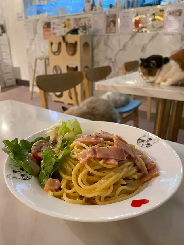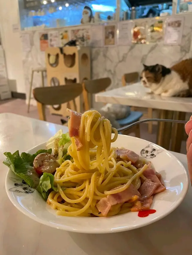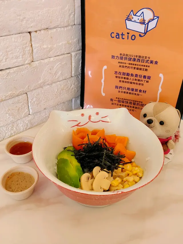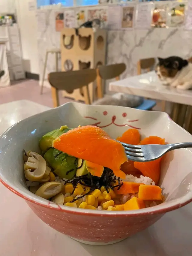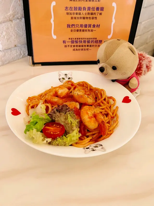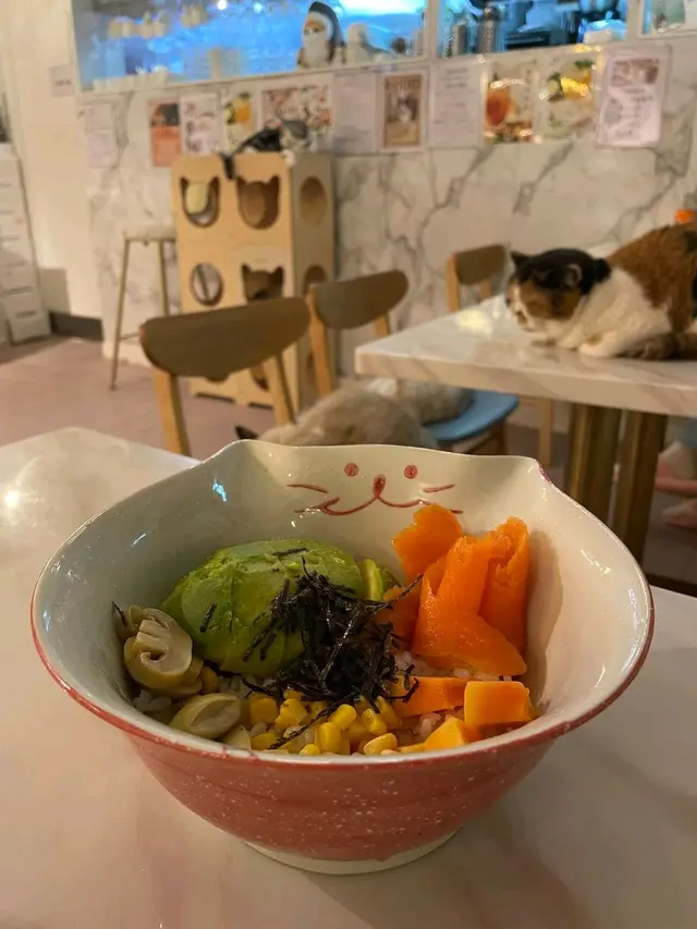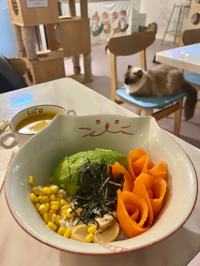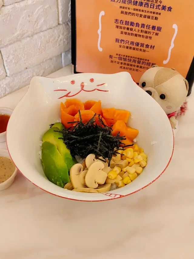 呢間寵物餐廳重點不是食物,而是好多不同的貓貓可以讓食客盡情打卡,同埋同啲貓貓一齊玩!老實講,對於沒有養慣寵物的人來說,在食飯的時候有啲貓貓走來走去,跳來跳去,甚至跳上枱或者跳上你嘅大髀,其實係會有啲唔習慣嘅;不過如果喜歡貓貓嘅朋友,相信會對呢間咖啡店寵愛有加,因為啲貓貓肥嘟嘟,其實都真係幾可愛。一入到餐廳已經見到啲小朋友同啲貓貓玩成一片,十分之開心,相信呢度都係一個可以帶俾好多小朋友歡樂嘅地方,環境雖然不是很大,但係佈置就好似一個貓貓遊樂場一樣,完全係一個貓貓嘅天地。可能因為都係俾啲愛貓之人共冶一羅的地方,所以感覺食物其實並不是主角,價錢亦會貴一點,不過食物質素都唔錯嘅。叫咗一個帶子蘆筍飯,真實版同餐牌相片完全係一模一樣,佩服!呢個飯配料擺放好精美,顏色好鮮艷,未食已經胃口大增,帶子都大大粒嘅,份量就不是很大,不過勝在好清新,味道都好味!配上一包紙包飲品,作為一個下午茶,消磨吓時間,我覺得絕對係冇得頂嘅!…查看更多
