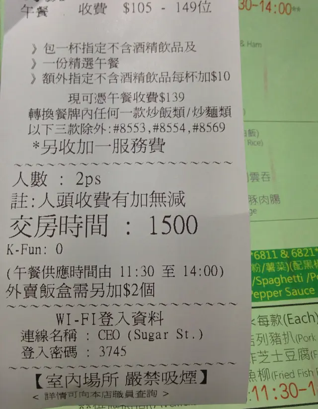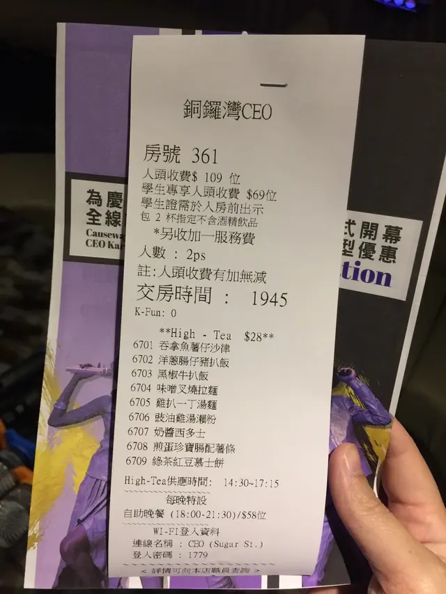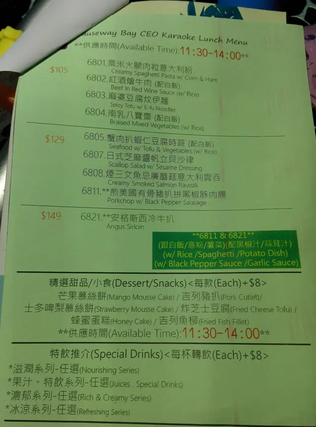 好耐都無去過銅鑼灣CEO唱K,於是趁星期五放假去唱K,兼食埋午餐。有9款選擇,我就揀咗粟米火腿肉粒意大利粉$105,朋友揀咗紅酒燴牛肉配白飯$105,餐飲一杯,我哋都叫咗熱檸水。大約等咗15分鐘,午餐就送到入房,於是大家都趁熱開始食。我叫嘅意大利粉味道都算唔錯,分量亦啱啱好,如果粟米粒可以加多少少,就會更加好食啦。而朋友叫嘅紅酒燴牛肉,無論睇或食,都覺得比較油,牛肉亦比較韌,好彩味道唔會太鹹,白飯亦都煮得唔錯,唔會太軟或太硬。今次叫嘅兩個餐都算可以,不過比起以前嘅食物質素就真係差咗少少,亦無奉送餐湯,幸好員工服務態度及房間設備都算好,收費平均每人$115.5,可以由早上10:30,唱到下晝3點,都算抵食抵玩。…查看更多