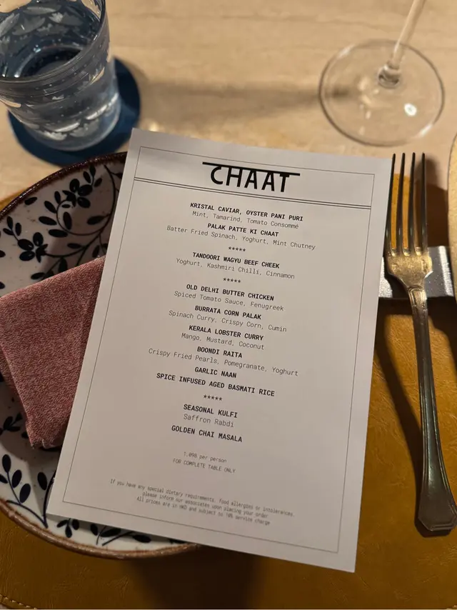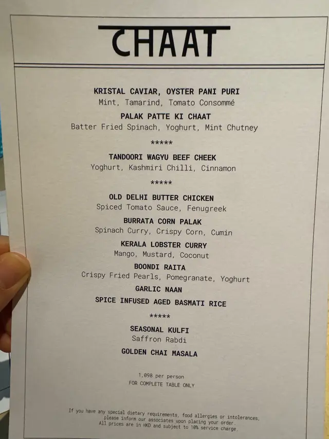 在 Leela 的食评中,小妹话 CHAAT overhyped,dining room 缺乏 authentic 的印度氛围,也欠 [ 如 Leela 的 ] 贵气和雅致 ,像 high street 食肆,就餐厅的装潢而言,价格进取 。小妹认为那些评语没有改变,不过小妹也没有说 CHAAT 不美味喔 😬。今日来 CHAAT 享受一个写意徐缓的午餐,午餐虽然也不便宜,有些 CHAAT 的优点在 Leela 食评中没有提及嘅,这个食评算还 CHAAT 一个公道啦(容后在【 总结 】说明)。∫ MANGO LASSI ****先来一杯 mango lassi。加了开心果碎,lassi 口感很浓稠,芒果味道够,甜度算高,也有微无姜味。小妹认为这杯 mango lassi 过于浓稠,几近吃乳酪。Set Lunch 之前,侍应先端上小吃 ∫ KHAKHRA | Mango Chutney 。传统的印度 crackers,加埋 mango chutney 吃,令人愉悦的午餐开始。** **头盘 ∫ PALAK PATTE KE CHAAT | Batter Fried Spinach | Yoghurt | Mint Chutney ****Set lunch 可以吃不同的头盘,例如 Angara Paneer Tikka,烤印度芝士,在另一次到访吃过,非常美味,但是今天一为食评,二为欲望,选择了招牌菜 chaat。CHAAT 把 chaat 这小吃隆重地呈现,你可以话他们把平嘢贵卖,也可以说他们带领街头小吃登上大雅之堂,观点角度,各自表述,小妹认为 CHAAT 的 chaat 味道浓郁而复杂,sweetness 与 savouriness 平衡恰当,综合起来是不单美观亦很美味,是否造作?斧痕著迹与否?自行判断。小妹觉得造作是有一点嘅,单是精致漂亮,令人食欲大增,这种造作可以接受喔。主菜 ∫ RAJASTHANI BANJARA GOSHT | Slow Cooked Lamb Curry | Onion | Yoghurt ****主菜四款选一,最为人熟悉的当然是 Old Delhi Butter Chicken 啦(这个留待下一个食评再谈),但今天小妹拣了 Rajasthani Banjara Gosht,一道羊肉咖哩菜式(长气再说一遍,☝🏽🙄 curry 这个字是英国人来到印度才有的,印度香辛菜式,千滋百味,怎能一字概括?但由于 curry 令行文方便,所以连印度人都常用,小妹也觉得可以用呢)。Banjara 是一个游牧种姓,他们并不茹素,喜欢吃肉,这个羊肉就是其料理中之表表者啦。CHAAT 的 Banjara gosht 用 lamb 而不取 mutton,可能贪 lamb 更嫩。咖哩也倾向「干式」的,汁酱已经 reduced 到一个程度那些洋葱蓉(?)似乎依附在肉上,不像 butter chicken 般有很丰富 creamy 的酱汁可以「捞」饭或者沾之以 naan 同吃。味道呢,比较深沉、和暖甜美中而带木药之香(有 cardamom 吧),不是那种跳跃香辛料的表现,那层叠的味道不容易体现,慢慢细尝,才啖出羊肉咖哩独特而丰富的 flavour profile。Side 小妹要了 ∫ VEGETABLES | Seasonal Vegetables of the Day ****因为今天额外要了 gucchi pulao(蘑菇印度饭),所以 side dish 不选 aged basmati rice,而选 vegetables (今天是椰菜花及 lentils)啦。蔬菜很入味,香味芬芳,口感稍冧,不是爽脆那种,都是很美味呢。黑松露餐牌中有这个米饭 ∫ GUCCHI DUM PULAO |Black Truffles | Morel Mushrooms| Spiced Aged Basmati Rice****话说 basmati rice 要 aging ,熟成令米更香,而且减低淀粉,令米饭更爽口,粒粒分明 ,但是因为旧,有点木气味,不是人人喜欢 🤔。小妹对这种印度米饭,十分 craving,二话不说于是要了 🫣。今天的这道米饭菜式,CHAAT 称呼它 pulao 不是 biryani。Pulao 和 biryani 同是印度米饭料理。Biryani 比较复杂,basmati rice 和材料层层叠叠,用密封锅蒸焗 (dum)而成。Pulao 本来比较简单,就是加入食材煮的「有味饭」。似乎 CHAAT 今天的 gucchi pulao 是 dum 的,也像 biryani 喔,这样小妹不知道怎样分 pulao 和 biryani 🙄 啦 。这个黑松露和羊肚菌印度饭,十分「贵重」,盛惠 $ 328 啦。小妹的印度朋友觉得 pulao 或者 biryani 几百块钱一份,匪夷所思 💰,是用贵价食材堆砌出来之物。他们告诉小妹,要知道孟买平民区的 mutton biryani,十分美味,真材实料,用 rupee 计不用港币 $ 20 🙄。当然 CHAAT 要把街头食物精致化,相应用料质素高,价钱也要「符合」精致的程度嘅,不可跟真正孟买街头食肆同日而语呢 🤭。话须说回头,小妹未有踏足孟买,无缘一尝当地的 biryani 是否 $20 一份胜过今天三百多元。至于今天这个 pulao 小妹只能说是惊艳般的美味。夏天的黑松露,是澳洲来的啦,由于是真松露,那「电油」气味芬芳,没有松露油的「化学工业风」挥发性味道 ,🤩 跟 morel mushroom 和谐共处。Pulao 米饭因为是蒸饭,比较柔软,不是煮 basmatic rice 的相对较硬。∫ PLAIN NAAN。Naan bread 柔软,烤得香,上质,觉得没有甚么负评啦。做得好的 naan,和很好的,似乎分别很小呢。****∫ KULFI | Saffron Rabdi ****甜品是雪糕 (kulfi),而 saffron rabdi,即系藏红花「炼奶」。Rabdi 是长时间烹煮而至 reduced 了的牛奶,味道香浓,做成 kulfi,因为低温而减低了舌头上的甜度,是美味的。今天的水果,不时不吃,是很合时的芒果喔。 整体上是 Leela 的「突厥蔷薇雪糕」 Ispahan Rose Kulfi 胜一筹嘅。印度餐没有 ∫ MASALA CHAI 不行。****Masala chai 是 pre-sweetened 的。可能迁就香港口味,下糖克制,茶香浓,味一点甘苦,也够滑,十分美味。∫ 总结 【 一个公道 】CHAAT 没有因为 Chef Tuli 离开了,Chef Kuthari 把 signature style 和味道改变。反而 Chef Tuli 说 Leela 不是 CHAAT 2.0,Leela 不同的菜式中,还是蕴含他在 CHAAT 时候嘅招牌美味呢。 万般不是,CHAAT 的食物还是美味的 。 整个食评,到此才是重点:CHAAT 的 front-of-house 团队,十分专业,眼所见,每一个人都昂首挺胸,女侍应是尼泊尔人,服饰传统,男的是印度或者南亚裔,一身 Kurta,一双皮鞋,头发整洁,庄重得体。 由侍应到经理不单有礼貌,服务周到,对餐牌熟悉,而且热诚,服务很 personal。跟侍应和经理谈了一会,天南地北,感觉很