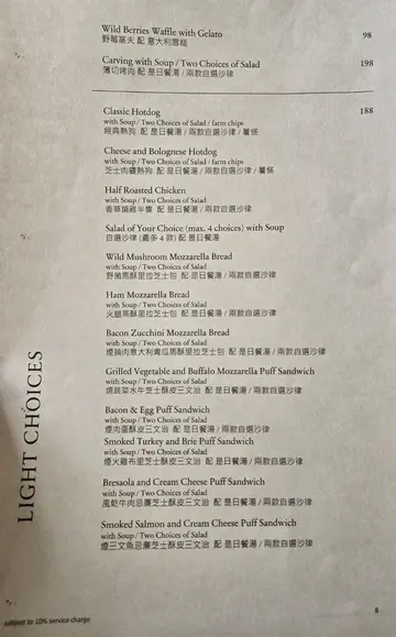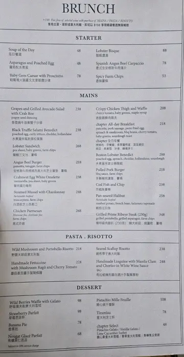 位于IFC一楼的Chapter,中午主打三文治面包,晚上转为提供happy hour 及2 courses晚餐的地方。2 courses晚餐有头盘、主菜(扒或意粉)可另加$48选甜品主打的烧美国肉眼扒190g $388以精准火候锁住肉汁,焦香外层包裹著淡粉红肉芯,咀嚼间溢出浓郁脂香,略嫌份量精致。加拿大斧头猪扒 $388展现惊喜弹性,厚切三指宽的肉身搭配微呛芥末酱,巧妙平衡丰腴感。黑松露蘑菇汁手制阔条面 $228香气袭人,酱汁浓郁能紧裹面体,赞!龙虾汤浓郁度直逼西班牙海鲜炖饭,藏著细碎龙虾肉惊喜。大蒜薯仔汤绵密如慕斯,蒜香温润不呛辣。配菜中香辣薯条撒上自制辣椒粉最为亮眼,脆度与辣香层次分明。收尾的开心果千层酥+48,酥皮空气感十足,夹馅坚果香气优雅,完美句点。整体价位偏高,但肉品处理与酱料搭配颇见心思,适合追求质感的肉食主义者。