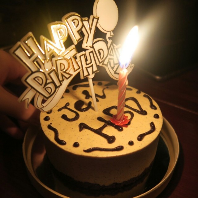 仔女在我生日给我买了个里约热内卢蓝莓芝士蛋糕,前一天已订定。其实$138一个4"蛋糕对比一般店铺真是颇贵,但对比一些名店都相对ok。难得生日,便试试!在生日歌的伴随下,他们捧出蛋糕。我首先见到个好迷幻的蓝莓紫和一些巧克力装饰,很美。原来是他们在Cheesess买了$15巧克力笔,可以在那里或回家写,而他们回家看看youtube chocolate garnish video,学学那些摆设技巧,有心思