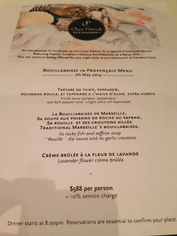 Chez Patrick 是知名的法国菜馆,马赛海鲜汤更是招牌菜式之一,得知有普罗旺斯马赛海鲜汤之夜,当然勿失良机!位于湾仔的 Chez Patrick 餐厅有私人电梯直到。大门招牌上有美食图片,令人食欲大增。环境雅致舒适,简洁光明。餐具如是,白色为主,感觉高雅但不奢华。 Bouillabaisse in Provencale Menu三道菜晚餐,每位$588,价钱非常合理。