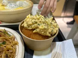 系社交平台红左既意粉店,满心期待去试下辣味蒜香大虾意粉惹味既,但有小小苦左既蒜头味,份量系冇得输,虾都弹牙,但真系唔值得排队去买黑松露蛋沙律爆薯呢个小食都几创新,外壳系吉列脆皮,入边系劲creamy既薯蓉,但同黑松露蛋沙律唔太夹,个酱系冻既,但爆薯热辣辣,食上黎有d怪,仲要食到底既时候,有一层油系到,就知真系好油腻🙂↔️不了