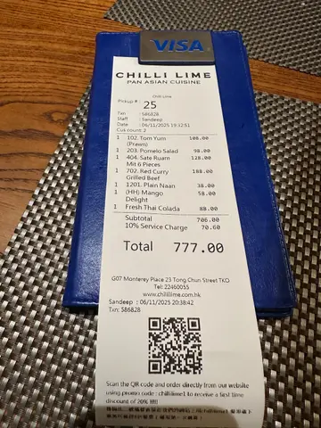 Chilli Lime主打东南亚食物,有齐泰国、马来西亚、印度美食,岩晒心大心细唔知拣咩嘅选择困难症人士大虾冬荫功汤🦐作为泰菜爱好者,冬阴功汤真系每次都系必嗌嘅item,呢款冬阴功汤又好浓嘅香料味,但略嫌唔够辣,如果辣啲就再正啲啦柚子大虾沙律柚子清甜多汁,唔会有酸涩味,配上花生碎、椰丝同酸辣汁,真系好开胃串烧(鸡肉、猪肉、牛肉各两串)串烧好出色,各款串烧都腌得岩岩好,烤得外脆内软,仲好juicy红咖喱槟榔叶烧牛肉配Naan 🥩🫓烧牛肉份量多,牛肉味浓,加上香浓嘅红咖喱汁,配上Naan真系好「送饭」Mango delight 🥭唔想饮酒嘅朋友一定要嗌呢杯mango delight,成杯野饮劲澎湃,饮落仲要有劲浓芒果味Fresh Thai Colada🥥🍸嗌嘅时候,外籍店员好好咁提醒:This is not 椰青😂😂,以原个椰青上,配上Rum酒调制而成,饮落有清甜嘅椰子味,仲有淡淡嘅酒味,饮落好清新好易入口…查看更多
