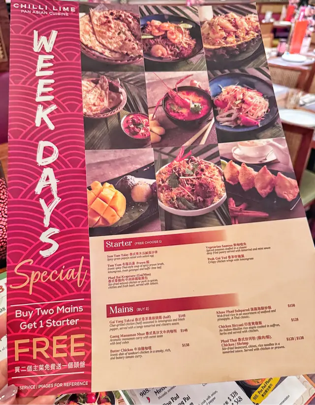 Chilli Lime主打東南亞食物,有齊泰國、馬來西亞、印度美食,岩晒心大心細唔知揀咩嘅選擇困難症人士大蝦冬蔭功湯🦐作為泰菜愛好者,冬陰功湯真係每次都係必嗌嘅item,呢款冬陰功湯又好濃嘅香料味,但略嫌唔夠辣,如果辣啲就再正啲啦柚子大蝦沙律柚子清甜多汁,唔會有酸澀味,配上花生碎、椰絲同酸辣汁,真係好開胃串燒(雞肉、豬肉、牛肉各兩串)串燒好出色,各款串燒都醃得岩岩好,烤得外脆內軟,仲好juicy紅咖喱檳榔葉燒牛肉配Naan 🥩🫓燒牛肉份量多,牛肉味濃,加上香濃嘅紅咖喱汁,配上Naan真係好「送飯」Mango delight 🥭唔想飲酒嘅朋友一定要嗌呢杯mango delight,成杯野飲勁澎湃,飲落仲要有勁濃芒果味Fresh Thai Colada🥥🍸嗌嘅時候,外籍店員好好咁提醒:This is not 椰青😂😂,以原個椰青上,配上Rum酒調製而成,飲落有清甜嘅椰子味,仲有淡淡嘅酒味,飲落好清新好易入口…查看更多