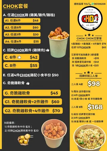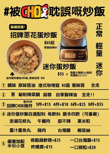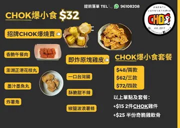 葵广出名多特色小店同扫街,其中一间去衬葵广必食嘅小店就系Chok 鸡啦! Chok 鸡除左有自家味份可以自选调味(个人推荐紫菜加孜然),仲有新推出炒饭。鸡肉全部都系新鲜买番黎老细自己腌同整炸粉,即叫即炸,连锁店嘅炸鸡完全无得同佢比。 因为我系唔系食得牛虾蟹,个炒饭走牛虾蟹,老细好人转左自家制辣菜脯,非常惹味,葱花鸡肉辣菜舖炒饭,隐藏菜式大家可以试下👍🏻 老细仲好花心思自己整左炸鱿鱼须,都系由原只鱿鱼自己洗自己整嘅出品,比出面买到嘅鱿鱼须大条好多,有咬口得黎唔靭。期间限定菜式熟客自己去问就买到架!…查看更多