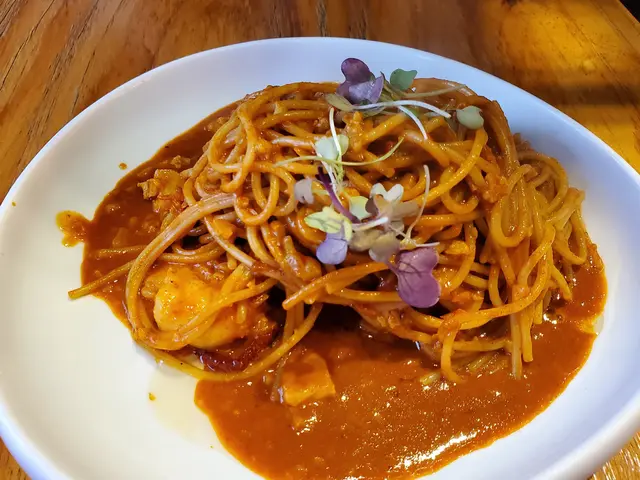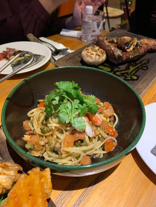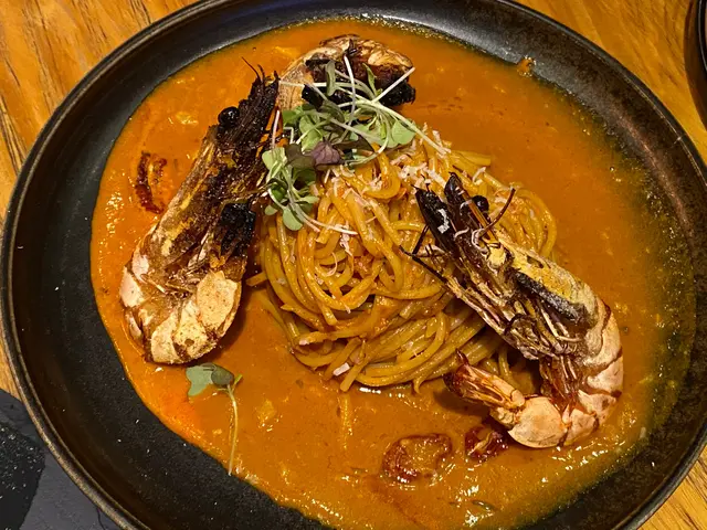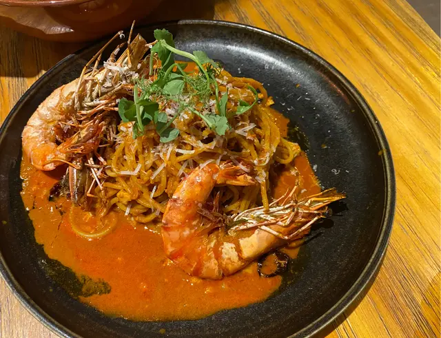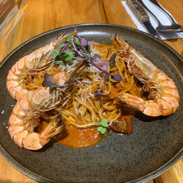 鹽燒老虎蝦意大利麵配風乾蕃茄龍蝦醬。巴馬臣芝士