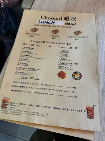 呢间系喺大角咀嘅一间小店,有韩国嘢食所以入左来,餐厅唔大好有人情味,中午嘅时候同朋友一齐买外卖食,韩式饭卷睇落好吸引,有三款拣,分别系辣猪肉、牛肉同埋原味~ 食咗一个牛肉嘅,紫菜上面充满满满嘅芝麻油香味同白芝麻!同日式饭团寿司比起上嚟,本身已经调好味,所以唔需要再额外加酱料,饭卷好多料,仲多个饭好多,感觉到好有诚意,有牛肉、萝卜、蛋丝等等好够饱肚!口感劲丰富!觉得比起尖沙咀嘅饭卷仲好食!另外叫咗一个set lunch,50蚊可以菜同主食配搭,加左10蚊要芝士安格斯牛肉汉堡🍔 佢选择够弹性,可以配唔同嘅主食,饭面沙律都得,食得韩国嘢梗系加$10要韩式拌饭,果然冇拣错,因为有芝麻油香,有波菜、芽菜、萝卜、紫菜、粟米等等,咸咸香香,脆卜卜,口感好好,芝士溶落去好Juicy , 牛肉份量都好多,厚身既安格斯牛肉,肉味好浓郁,超级饱肚, 柠檬茶都好足料,呢个价钱嚟讲几抵食,又多选择!