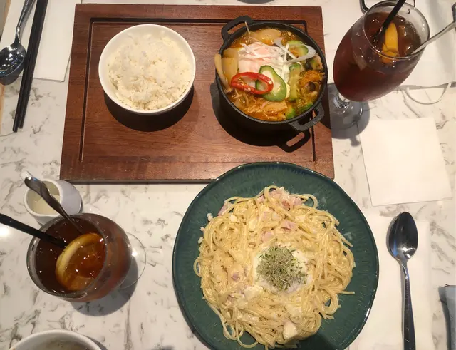 今日放假特意黎黃竹坑食午餐。我哋2:30左右先入嚟,人流不算多不用等位。本身勁想食炸豬扒和招牌burger。點知一坐低就告知都賣晒!☹️於是我哋就睇吓仲有咩嘢食。點知唔夠1分鐘。侍應就行埋黎企定定睇住我哋,我哋同佢講:仲睇緊Menu。佢就行開咗。但好奇怪地又唔夠1分鐘佢又翻返嚟問我哋要食啲咩,重複咗三次。真係好無奈!佢Menu有好多頁我哋都需要時間去睇晒㗎😡!俾佢催到最後我哋快快脆睇完快快脆落餐!好不滿意她這種服務態度!至於食物方面很令人滿意。我哋點左個豆腐豚肉湯配白飯、卡邦尼意粉配溫泉蛋。前菜有湯和沙律選擇,我們選擇了沙律,沙律很酸酸甜甜很開胃。然後主菜來了!不得不讚的是兩款食物和相片都是一模一樣。二味道都好好。豆腐豚肉湯朋友說吃下去有韓國的味道,而我就覺得這個湯底做得好好有肉味嘅鮮甜亦都有微微嘅辣,適合不想吃太辣的朋友,分量亦充足。卡邦尼意粉配溫泉蛋有很濃的忌廉芝士味,見到個樣已經好吸引,意粉上的也有很多芝士碎。吃下去超滿足,超濃的忌廉芝士,是我吃過最好吃的卡邦尼意粉。飲料我們選了檸檬茶,偏向平時飲開嘅苦,但入口後有種回甘香的味道,剛剛好可以中和卡邦尼意粉的油膩感!希望下次來不會再被催落單,下次希望能吃到植物肉芝士漢堡配薯條餐和炸豬扒。查看更多