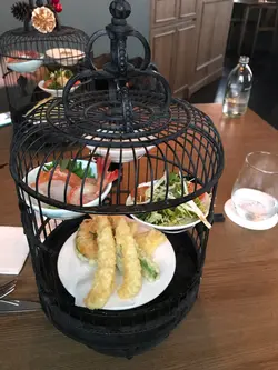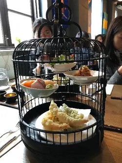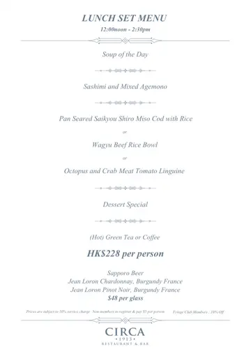 早前和一位长辈于Circa 门前候车,大家好奇Circa 究竟提供什么菜式,就约定于今天来吃个午餐。一看午餐餐牌,我会说这里是主要提供日式餐点的地方。午餐包括汤、前菜、主菜、甜品及饮品,其中主菜及饮品均可以选择。当中令我最深刻印象的为前菜,上菜时用一个方形的盒子,外面舖满树叶,面层铺满小石头,同行长辈的第一感觉为: “整式整水!” 而我倒是觉得挺过瘾!方形盒子的面层放了刚炸好的炸物,包括酿鸡翼、芝士饼等,热腾腾的香气飘入鼻腔;而打开盖子为不同种类的鱼生片!鱼生片蛮新鲜,只是有某些种类比较多筋,个人不是太喜欢,毕竟食鱼生要入口即溶才过瘾嘛!主菜我选择了拖罗茶渍饭。茶渍饭的卖相很好!女孩子看到一定喜欢!服务生替我于碗内注入焙茶,配著搅碎了的拖罗蓉,咸咸香香的,真的不错!整个午餐最值得一赞是服务生总在对的时间出现,于我们完成一道菜时及时上另一道。中环人总是心急嘛!…查看更多