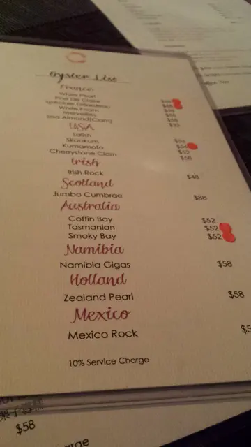 能在weekday以团购价享受优惠的午餐是很难得的机会, 一定要等待假期才可, 幸好可在这圣诞假期遇到这团购优惠, 菜式相当吸引, "想食的我"当然唔会错过。环境餐厅门口有一块以黑底灯光字制的招牌, 很抢眼耀目。外面感觉阴阴暗暗, 颇有情调, 进入里面原来很光猛。此餐厅位于铜锣湾的亨利中心18楼, 我们的座位刚刚对着窗, 在这么高的楼层望出去, 许多建筑物都在脚下 :) 。餐厅以枣红色为主, 地方不算大, 虽然枱与枱之间空间不多, 但都坐得很舒服。这里主要以存放红酒作摆设, 相信主打红酒配生蚝。服务我们12:00nn到达, 连埋我们只有两枱客人, 静静的很舒服。眼见只有两位服务员, 她们都穿得整整齐齐, 脸带亲切的笑容, 非常友善, 服务态度良好, 上菜时还按菜式作简单的介绍, 无谂过买团购都有咁专业的服务质素!