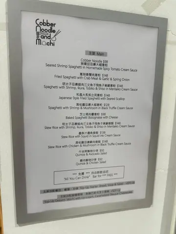 Cobber, a beloved dining spot, has made a delightful comeback with its new mochi-focused branch, maintaining the high quality I enjoyed at its original soufflé pancake location. The menu retains many classic mains and delivers excellent flavors consistently.Spaghetti with Shrimp, Ikura, Tobiko & Shiso in Mentaiko Cream Sauce ($148) offers a delicious blend of fresh seafood and a rich, well-balanced sauce. Fried Spaghetti with Crab Meat & Garlic ($148)offers a garlicky and slightly spicy richness.Stuffed Portobello with Pesto & Cheese ($56) impresses with its juicy, perfectly seasoned mushrooms, complemented by a savory, herbaceous pesto flavor. Baked Scallops with Mashed Potato and Mozzarella Cheese ($78) showcases fresh ingredients and skillful preparation. The scallops and potato deliver a buttery, oceanic depth.All You Can Drink option, featuring five solid choices, highlights the refreshing orange jasmine green tea, a harmonious mix of sweet orange and floral jasmine with an uplifting taste.Milk Mochi with Crushed & Caramelised Pistachios ($78) is a delightful dessert. Its sticky texture and nutty topping add a charming touch.Cobber’s return is a welcome addition. It gets full house during early dinner hours.…查看更多