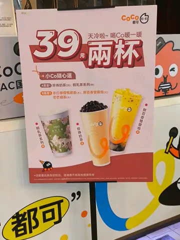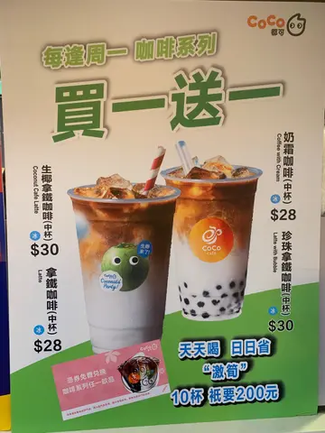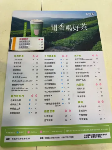 台式茶饮店,提供多款茶饮如珍珠奶茶丶抹茶奶霜丶CoCo巧克力丶芒果益力多丶茉莉绿茶等。